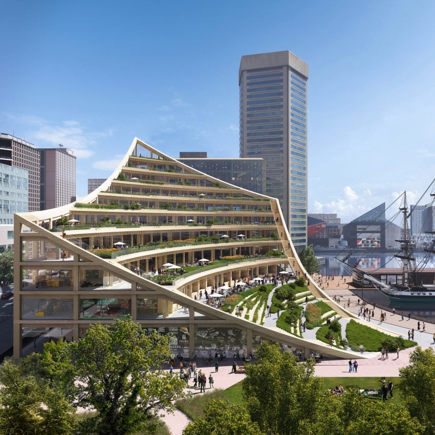 Le cabinet d'architecture danois 3XN a été choisi pour créer un bâtiment commercial à étages situé le long du port intérieur de Baltimore, inspiré par les voiliers. Ce design gagnant fait partie de la revitalisation du front de mer de Baltimore et s'inspire d'une requalification similaire en cours dans la ville d'origine du studio, Copenhague. "Pendant la plupart de ma vie, le front de mer de Copenhague était un port en activité, un lieu industriel, pas un endroit où les gens se détendraient ou apprécieraient leur ville", a déclaré Kim Herforth Neilsen, fondateur de 3XN.