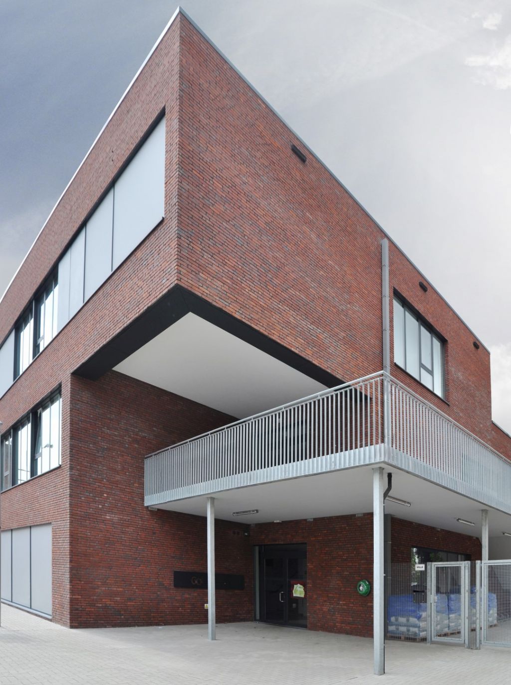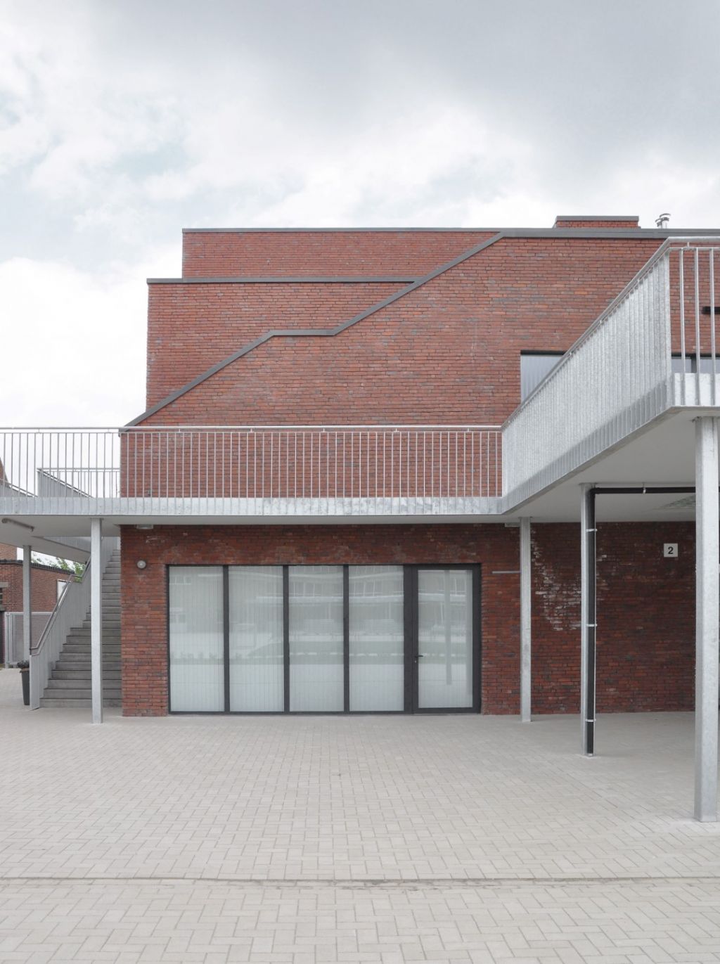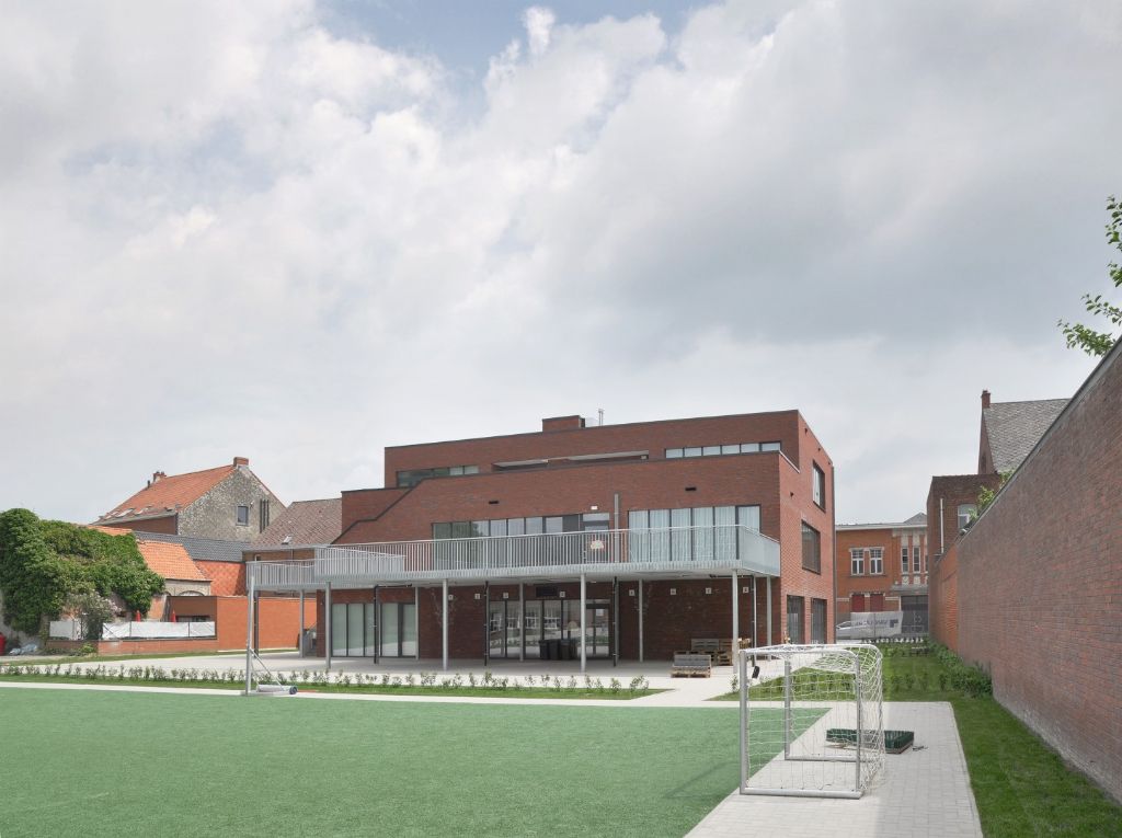 Le parti pris d’une localisation le long de la rue principale, fait que le bâtiment fonctionne en tant qu’enseigne pour l'école technique, tout en s’intégrant subtilement dans son contexte. Au sein du site, cette implantation permet à la cour et au parc de se fondre en un espace continu. L’accès principal le long de la Kasteelstraat est maintenu, ce qui améliore la connexion entre espace public et le campus, et renforce l’organisation générale du site. Une découpe de double hauteur dans le volume, là où sont situées les entrées au bâtiment, achève d’intégrer l’école dans son contexte tout en soulignant son rôle d’enseigne.