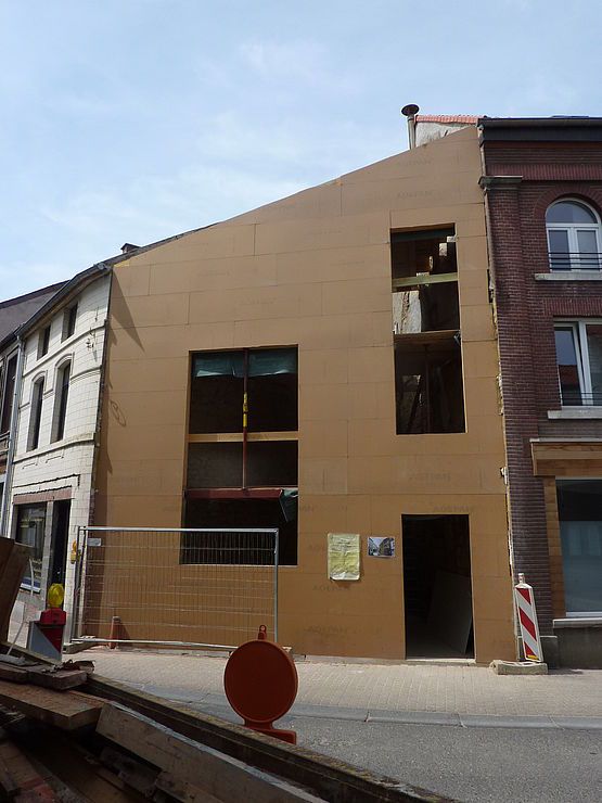 Bien que les dimensions de la parcelle soient forcément limitées, le défi qui s’est présenté aux architectes était de taille. Dans un objectif global de rendre l’accès au logement en centre urbain pour enrayer la désertification du centre-ville, le projet visait, selon les architectes, « à rendre une cohérence aux gabarits en présence par une harmonisation avec ceux-ci, à potentialiser au mieux les gabarits disponibles donnés par les pignons mitoyens et à dynamiser une singularité urbanistique du cœur de ville ». Traduction concrète de cette volonté de cohérence de gabarits, le projet relie les niveaux des faîtières et des gouttières des bâtiments contigus pour réaliser la continuité bâtie, et harmonise, par ce biais, les gabarits perçus depuis l’espace public.