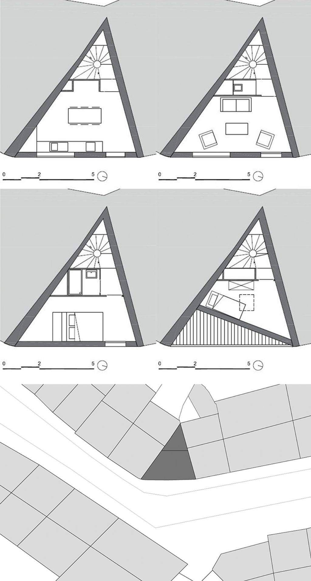 « Ainsi, seules les pièces de vie et de nuit sont présentes sur l'unique façade. L'épaisseur constituée par les locaux techniques et d'usages s'insère en second plan, permettant ainsi de libérer l'espace nécessaire au sein de l'angle aigu de la parcelle pour la colonne vertébrale que constitue l'escalier à noyau ouvert, surplombé par une fenêtre de toit distillant une douce lumière naturelle au travers des niveaux de l'habitation. »