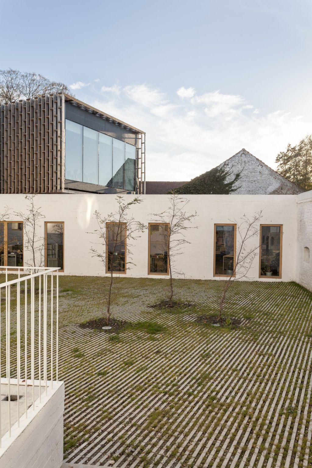 L'accès aux différents services se fait par une baie entourée d'un cadre en acier Corten, interrompant le mur aveugle blanchi à la chaux composé des pignons de l’ancien volume.