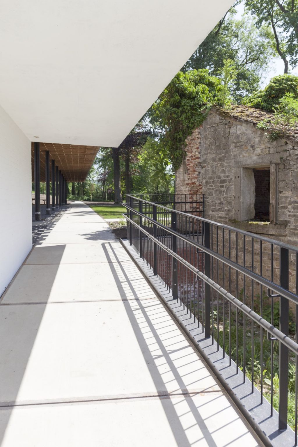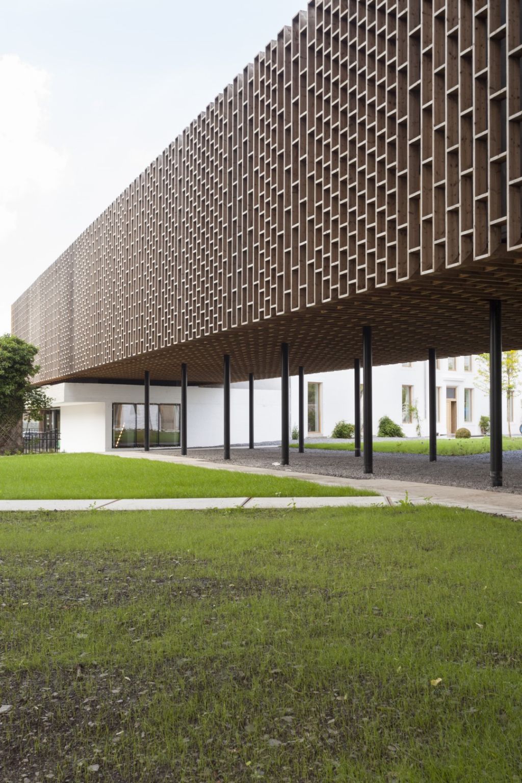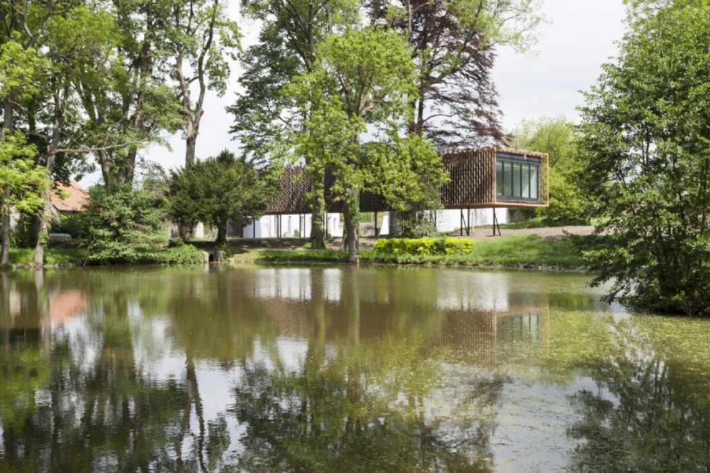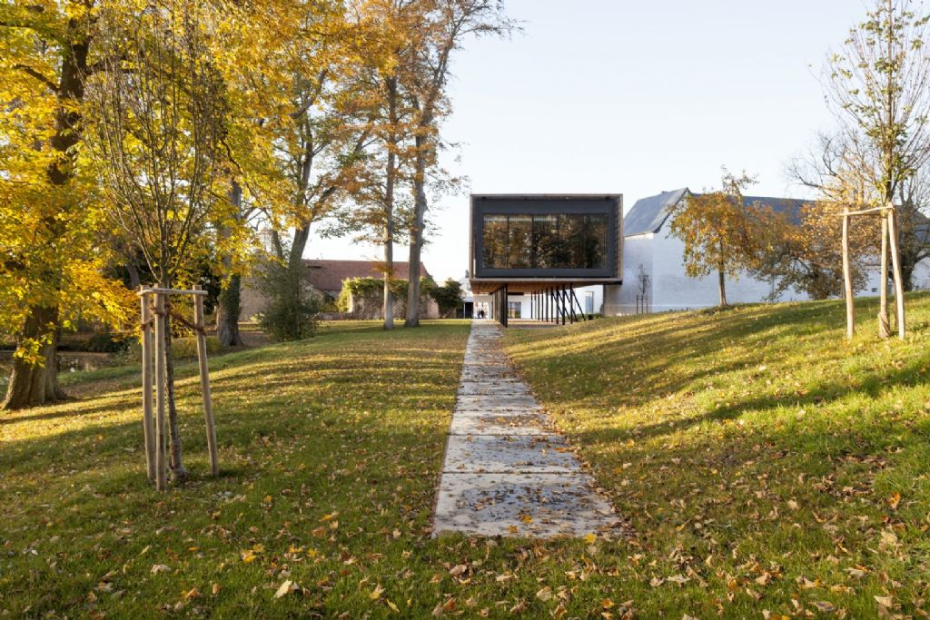 L'extension a la forme d'un volume flottant. A peine perceptible en entrant sur le site, l'ensemble revêtu de bois porté par de fines colonnes d'acier, jouxte un étang. La perméabilité du paysage entre l'ancienne entrée officielle et le parc est maximisée par ce volume aérien qui laisse passer les promeneurs.