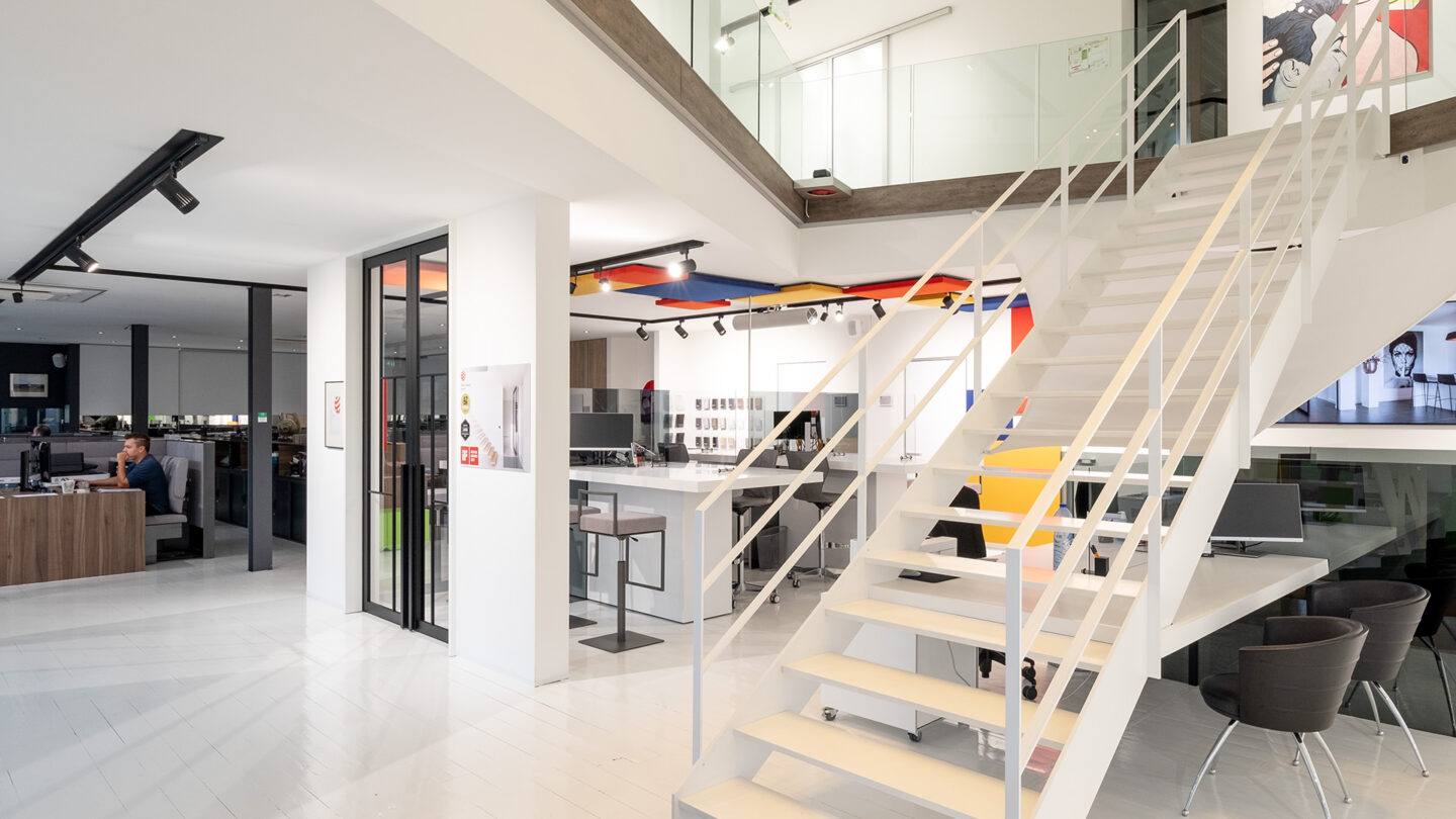 Les couleurs utilisées n'ont rien à voir avec les couleurs ni le logo de l'entreprise. Mais on est ici face à design élégant, avec essentiellement des tons blancs et noirs, soulignés par des zones rouges, bleues et jaunes éclatantes reliant les murs via les plafonds. Le fait que les panneaux soient accrochés aux murs et au plafond est unique. Les panneaux ne disparaissent pas en arrière-plan, mais ressortent élégamment. Ils attirent en tout cas tous les regards sur ce lieu de travail pas comme les autres.