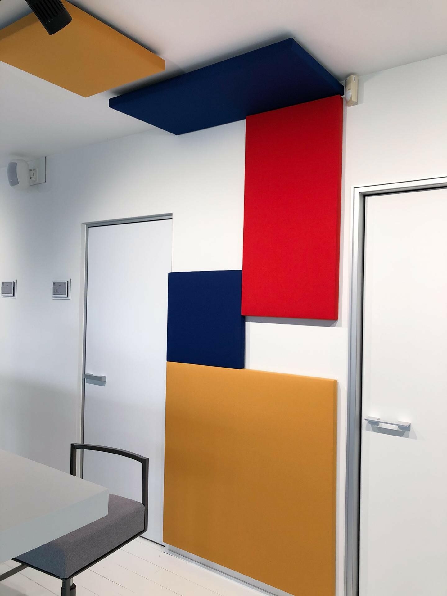 Anyway Doors souhaitait améliorer l'acoustique dans ses bureaux par la pose de panneaux qui devaient permettre une meilleure qualité de vie et augmenter l'intelligibilité dans cet espace de travail. Une idée étonnante a germé, celle d'utiliser des panneaux très colorés, s'inspirant des tableaux de Mondrian. Drisag s'est imposé comme le partenaire idéal pour mettre cette idée en pratique.