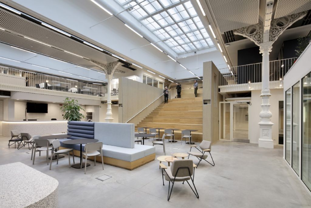 « Constructivement, le projet a intégré la contrainte d’une enveloppe classée ne permettant pas d’accès par les toitures ou de vastes baies de façade : les bétons sont coulés en place, le nouveau plancher de la salle des guichets est une structure mixte acier, pour les poutres et colonnes et bois pour les hourdis de grande portée, » ajoutent les architectes. « Le projet offre en outre une grande flexibilité d’usage pour ses occupants ou des acteurs extérieurs souhaitant y organiser évènements, projections, réceptions dans le foyer ou sur le rooftop desservi par un espace convivial. »