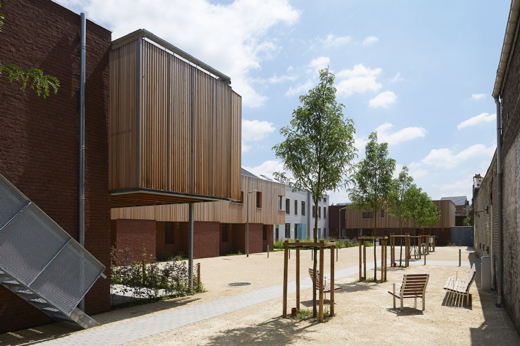 Le traitement des abords permet une séparation claire entre les deux propriétés (privées – semi-publiques) sans la rendre visible au quotidien. Le traitement du végétal et des revêtements de sol favorise une perception globale et riche de la parcelle tout en permettant des usages multiples. Les rez-de-chaussée sont traités à l’aide de maçonneries en briques pour leur continuité avec l’environnement et leur parfait comportement à long terme dans ces zones accessibles à tous et sujettes à un usage intensif. Les volumes du premier étage sont revêtus de lattes ajourées en bois ne nécessitant aucun entretien. Les interventions sont développées dans un langage contemporain, identifiable, dans le respect de l’existant. Cette référence semblait particulièrement pertinente à l’architecte car c’est une réalisation qui traite de logements très basse énergie et d’espace public en intérieur d’îlot dans un milieu urbain dense inscrit dans un projet de quartier global. C’est en évitant toute singularité, au profit de la globalité qui se décline dans la diversité que les formes ont été élaborées. Elles visent à permettre des expériences multiples pour ceux qui sont au centre de nos préoccupations : les habitants.