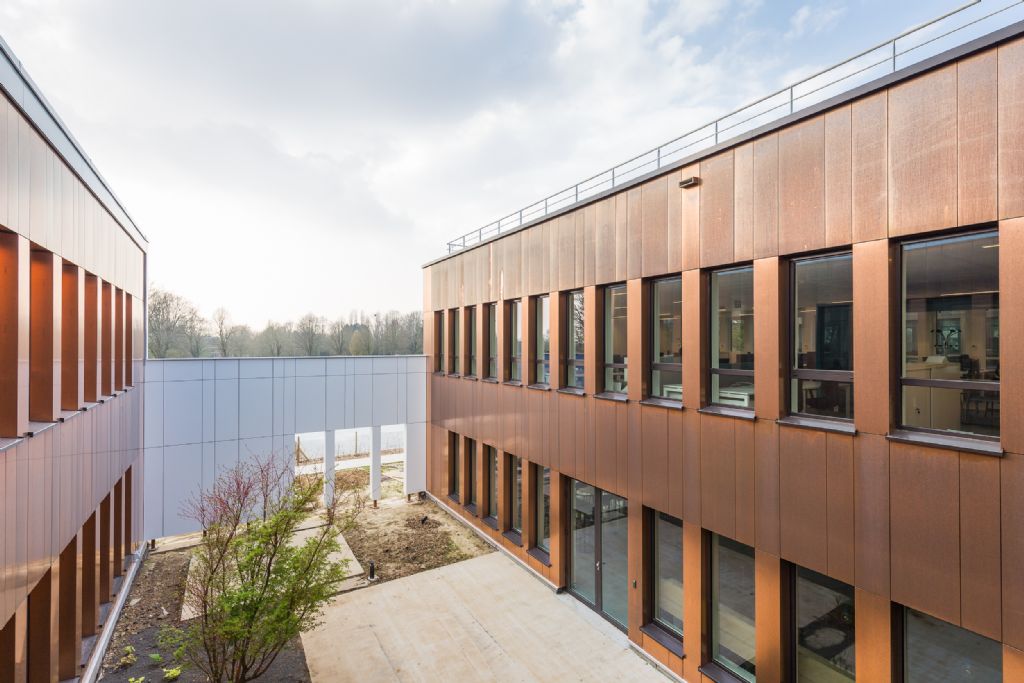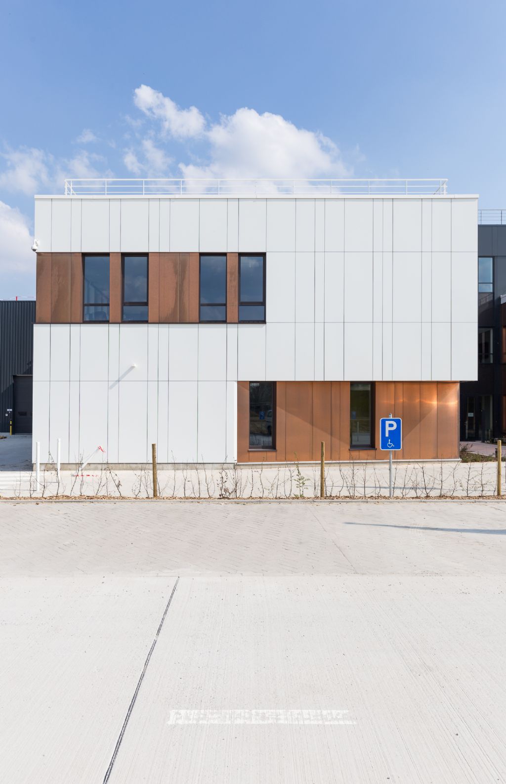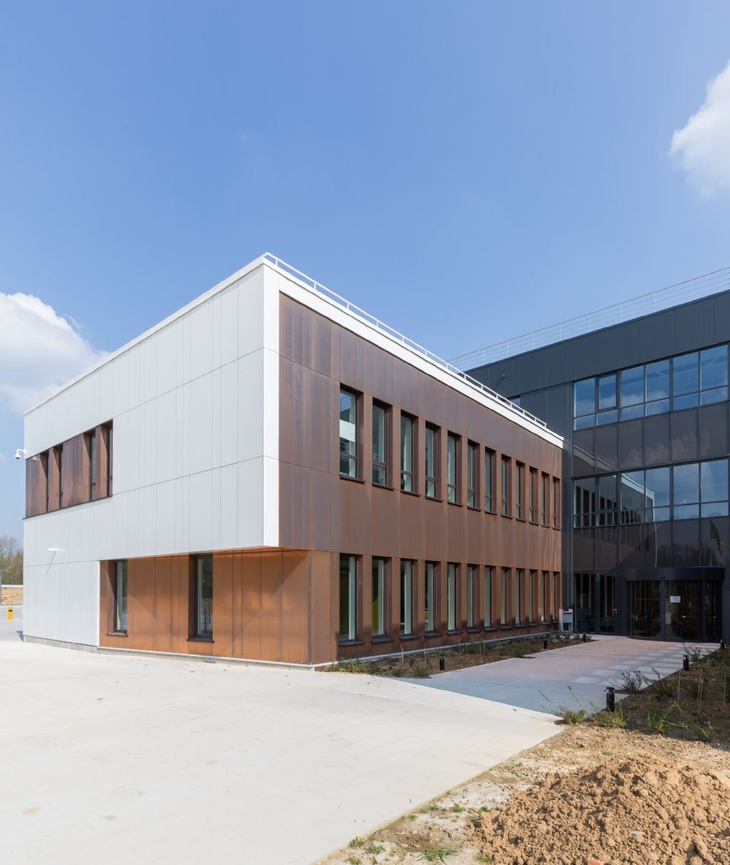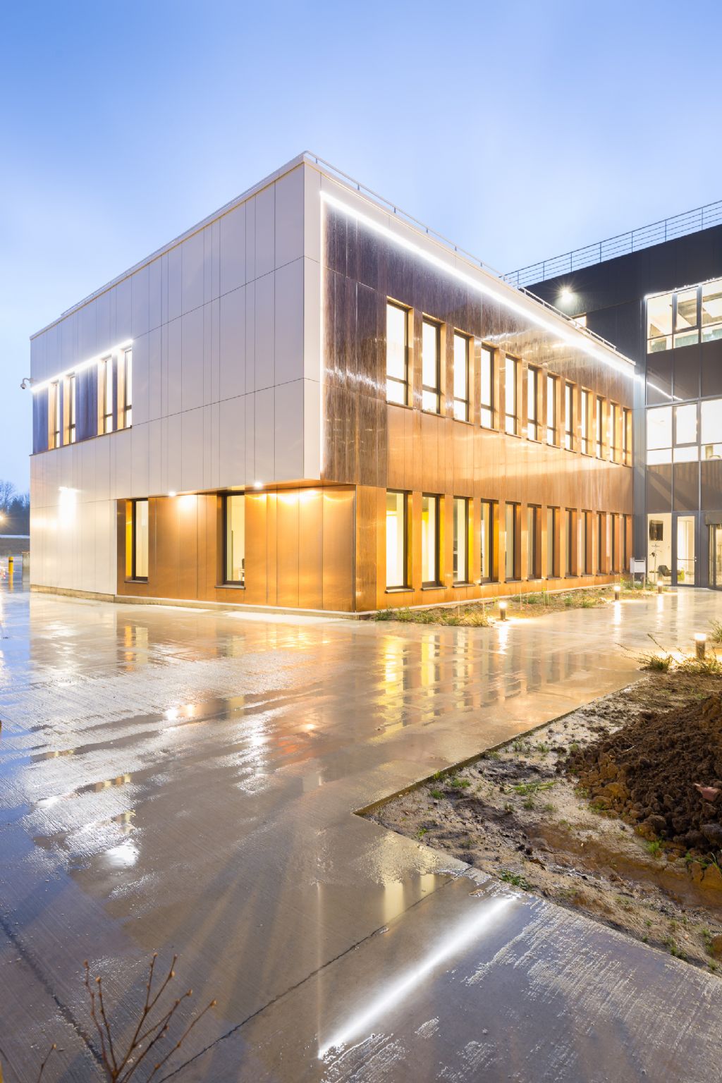 L’aspect paysager n’a pas été négligé non plus, même si l’ensemble est implanté dans un parc scientifique. Toutes les toitures des bureaux sont végétalisées pour permettre le développement d’un biotope local en combinaison avec l’occupation du personnel en période de beau temps. Des essences locales de plantations ont été privilégiées et mises en place autour du projet, et « tissées » avec celles, préexistantes, du site et du campus. Un bassin d’orage naturel et une mare agrémentent les abords tout en participant au développement du biotope (semi-)aquatique local