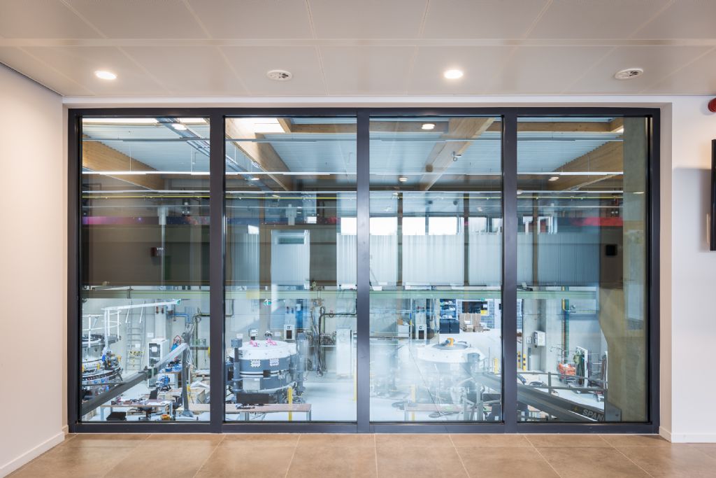 La « Beam Factory » comprend entre autres des zones d’assemblage, de stockage et de test des accélérateurs de particules tandis que les bureaux sont centrés sur l’efficacité et la convivialité. Le tout est réparti sur plusieurs milliers de mètres carrés où sécurité, espace, propreté et lumière naturelle règnent sans faille.