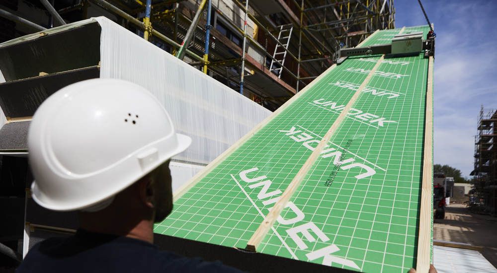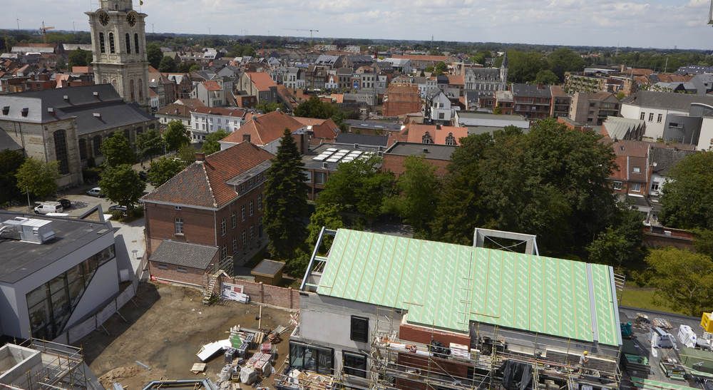 Les toits de Lokeren sont équipés d'éléments de toiture Unidek Aero Confort. Ces éléments étant livrés prêts à poser, directement sur les poutres de soutien horizontales, les toits peuvent être étanchéifiés à un rythme soutenu : une grande différence par rapport aux opérations de charpente, de couverture, d'isolation et de finition inhérentes à la construction traditionnelle des toits. En outre, la mise en place nécessite moins de main d'œuvre : deux à trois personnes suffisent à étanchéifier un toit.