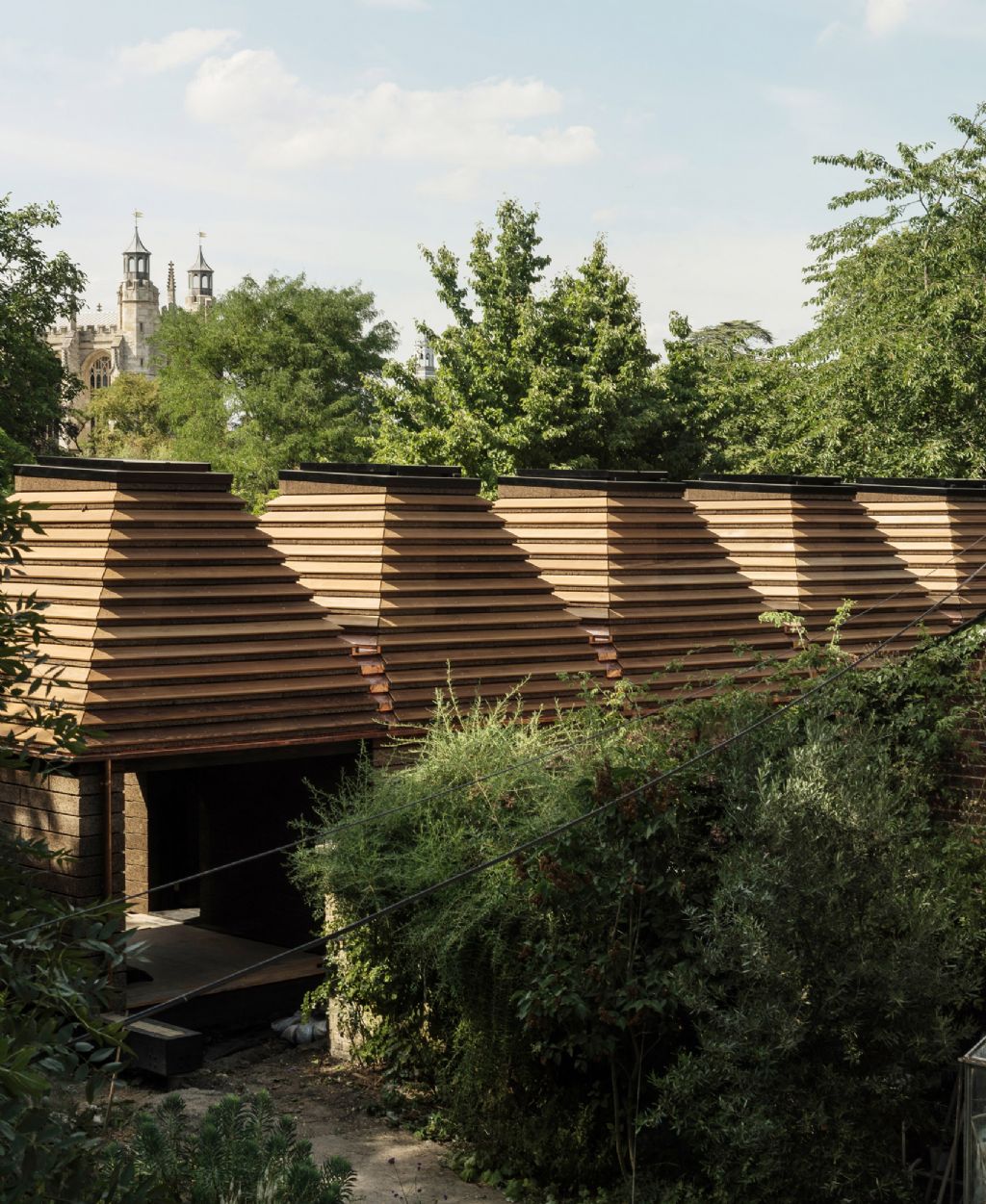 Sur une petite île de la Tamise, cinq pyramides gris argenté émergent au milieu des plantes, des arbres et des ruisseaux, formant un rythme structurel linéaire qui renvoie à la silhouette gothique de la chapelle du collège d'Eton. Mais The Cork House est bien plus qu’un bâtiment profondément ancré dans son envirtonnement : c’est une forme nouvelle et radicalement simple de construction basé sur le végétal. Les murs monolithiques et les toits en encorbellement sont presque entièrement fabriqués à partir de liège, un matériau bio-renouvelable. Ce kit d'autoconstruction, très innovant, est conçu pour être facilement démonté, ne produit pas de carbone pendant sa réalisation et produit un très bas niveau de carbone pendant son cycle de vie. Conçus comme un ensemble d'éléments, les blocs de liège expansé et les composants en bois sont préfabriqués hors site et assemblés à la main, sans mortier ni colle.
