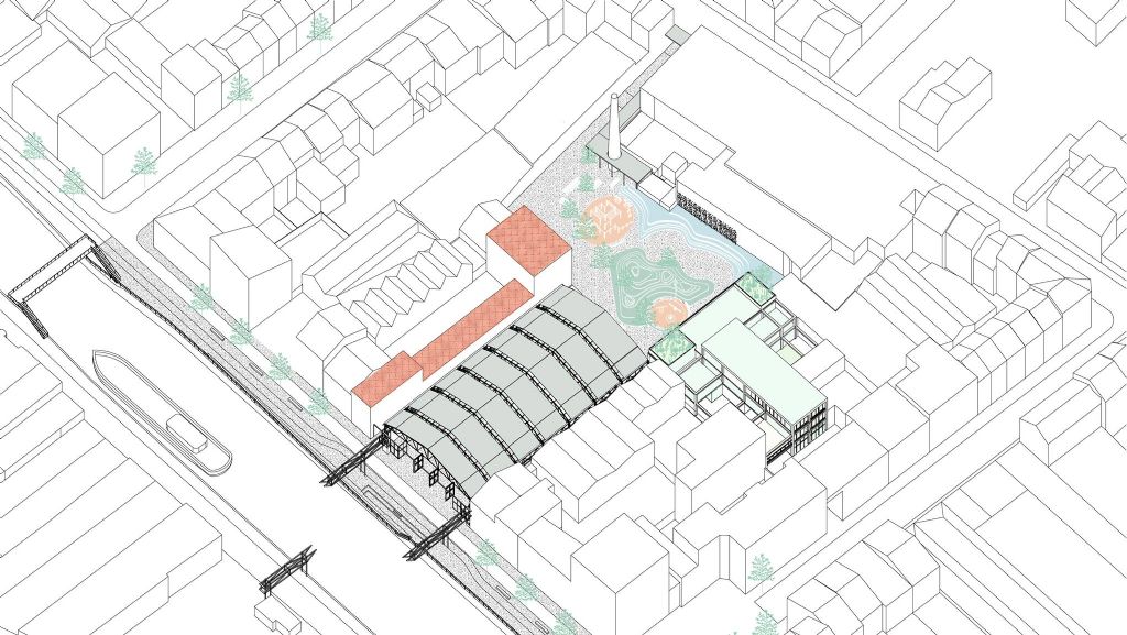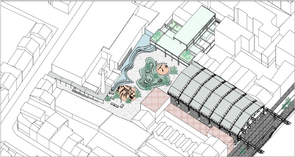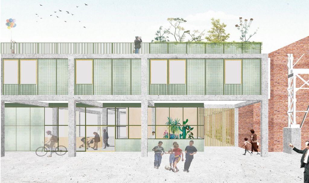 Le projet s'implante dans une ancienne halle industrielle construite au début des années 1920. Elle offre un espace couvert qui donne sur une butte de terre plantée d'herbe rase et d'arbres indigènes à haute tige en intérieur d'îlot.