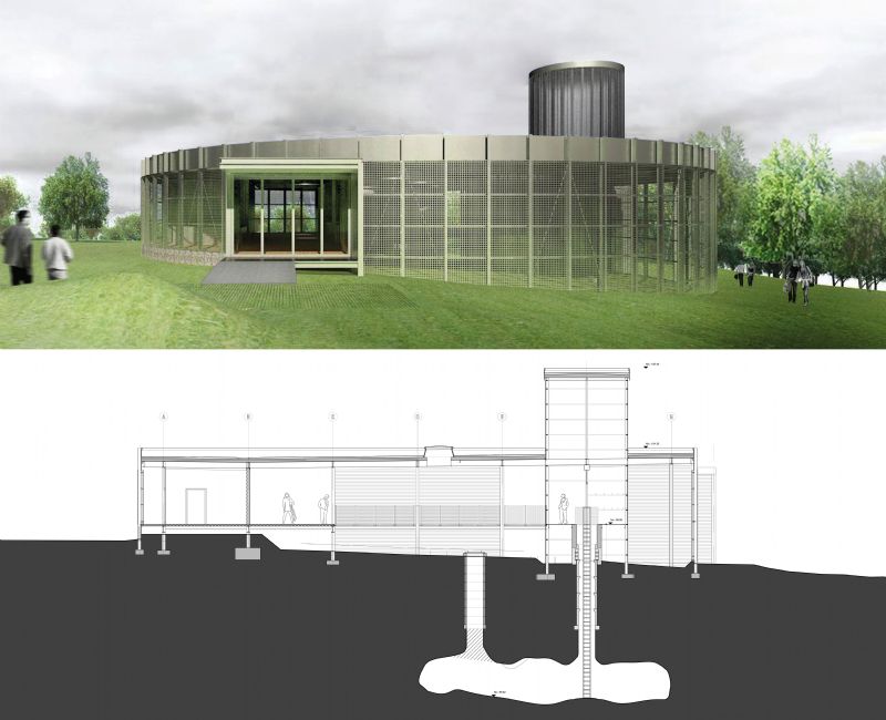 Le site sur lequel s’implante le pavillon présente un contexte très spécifique, d’une part par la valeur archéologique du sous-sol et des fouilles associées, et d’autre part par la présence de captages d’eau. Aux yeux des architectes, le principal défi dans ces conditions était de pouvoir offrir un projet au concept fort, malgré un ancrage impérativement léger et non-intrusif. En réponse à ce contexte, les architectes ont conçu un pavillon, bâti sur pilotis, présentant un volume cylindrique, et une certaine transparence. La construction semble flotter au-dessus du territoire des archéologues, « comme une couche de lecture contemporaine, tramée et minimale », diront les architectes. A l’intérieur, les fonctions d’accueil et de vestiaires, les espaces d’exposition et de projection et une petite boutique sont disposés le long d’un parcours scénographié et didactique qui surplombe le site de fouille et amène jusqu’au bord d’un des puits d’extraction, ouvert au public. Pour les architectes, le principal atout du projet est d’avoir évité toute notion d’esthétisme, étrangère au lieu et à sa fonction. La construction du pavillon est volontairement rationalisée et dépourvue de recherches stylistiques. Elle utilise le vocabulaire architectural du monde des fouilles vivantes et de ses constructions légères, temporaires qui n’ont d’autre vocation que d’abriter le travail des archéologues. Léger, transparent, le pavillon s’abstrait pour concentrer l’attention sur son contenu.