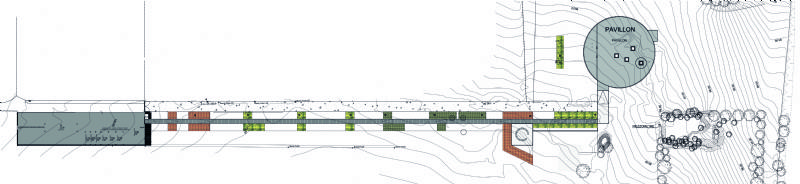 Les enjeux du projet sont multiples, ils touchent des notions de paysage, de culture, d’histoire, dans une optique de préservation, de valorisation et d’intégration. Le bureau d’architectes Holoffe & Vermeesch, fidèle à ses convictions, aborde le projet avec la philosophie du « faire beaucoup avec peu ». Le domaine dans lequel s’inscrit le projet s’étend sur environ 100 hectares. Pour les architectes, la lecture des lieux impose un regard quasi géographique et une intervention fine et étendue qui révèle l’échelle du site et amène progressivement le visiteur au cœur du projet. Un scénario de visite est conçu et matérialisé par un ensemble de dispositifs architecturaux : un portail signalétique d’entrée, une longue promenade surélevée et un escalier menant au lieu même de la visite. Un cheminement rectiligne s’invite sur le site de manière pudique, soumise à la présence des lieux. Le parcours aboutit à un pavillon, semblant avoir été délicatement posé sur le site des fouilles archéologiques.