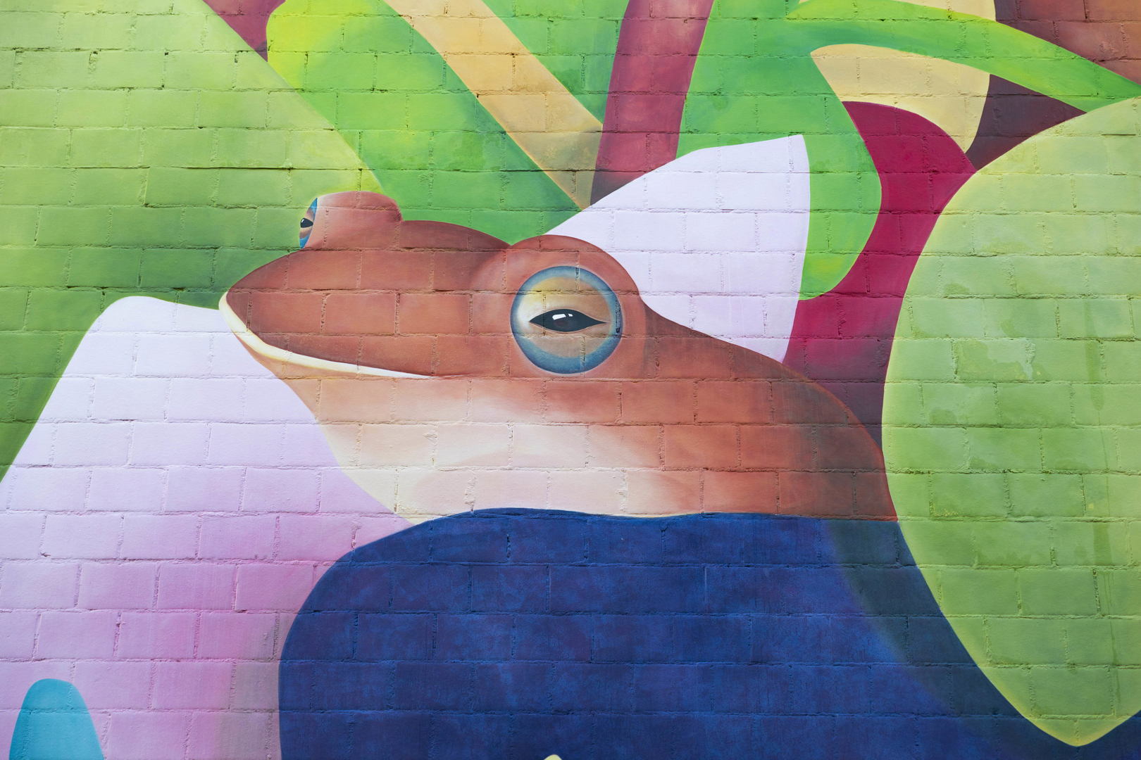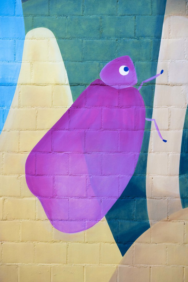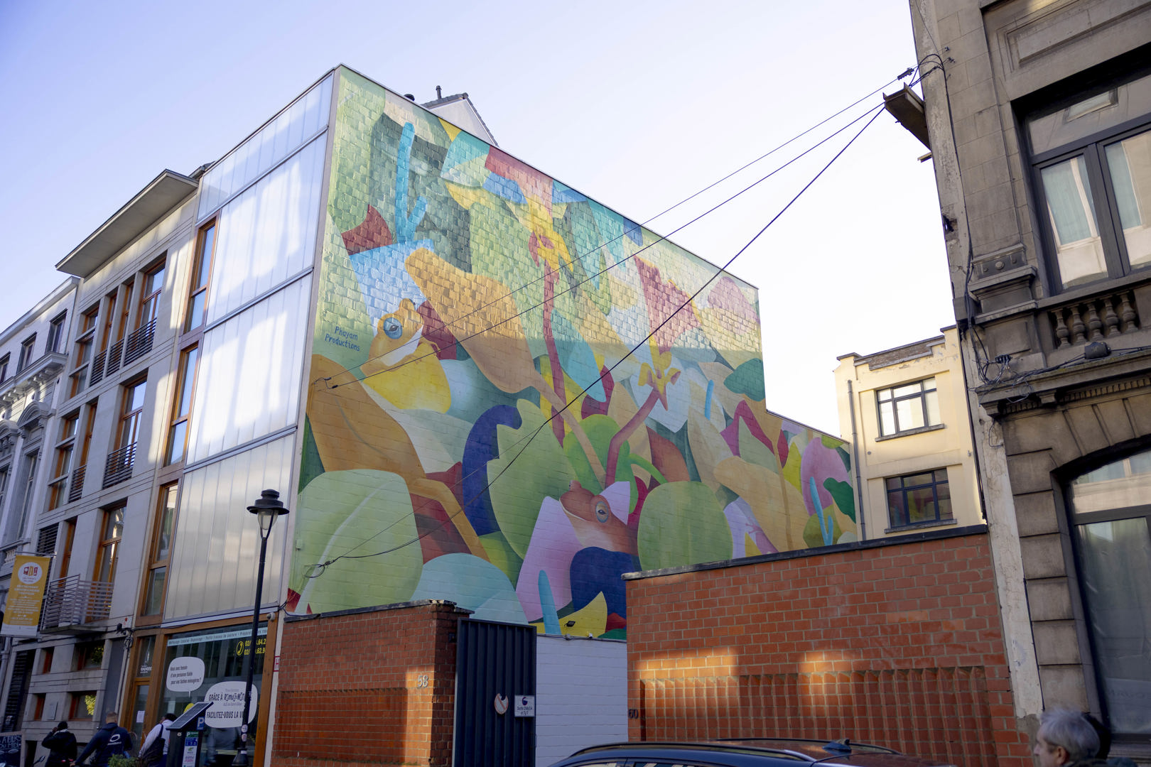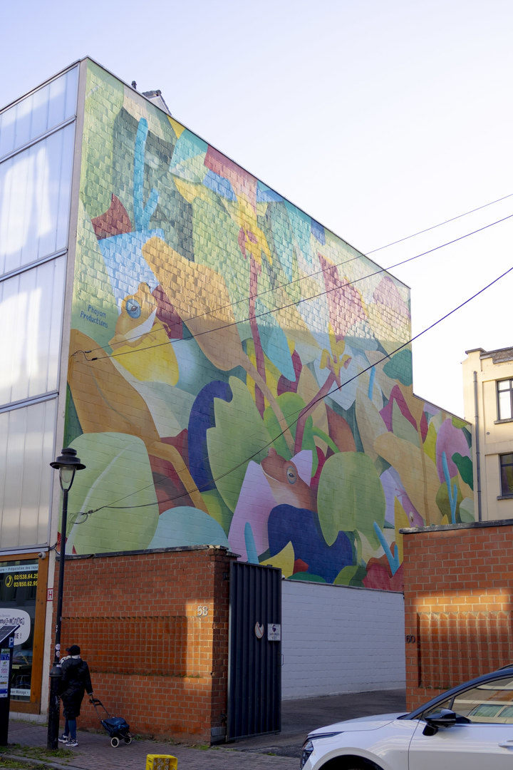 À Saint-Gilles, leur nouvelle création a été co-construite en partenariat avec l’asbl QUEF, à la suite d’ateliers de peinture menés avec des enfants du quartier sur le thème de la végétalisation. Issue des idées recueillies lors des ateliers, la fresque fait dialoguer nature et paysage urbain au coeur du quartier du Midi.