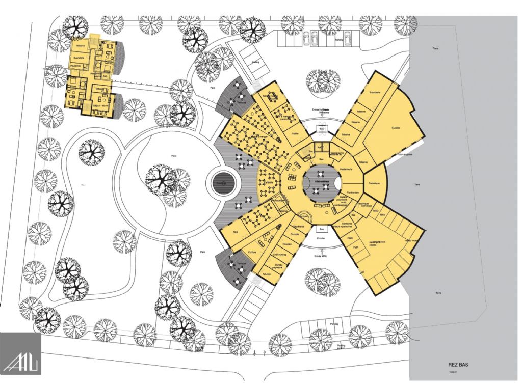 Le projet consiste d’une part en une MRS de 6.100m², répartie sur 3 niveaux. Le rez-de-chaussée semi-enterré comprend les locaux administratifs, les locaux du personnel, les locaux communs (accueil, salle à manger, espace polyvalent…), la cuisine et les espaces techniques. Les 102 chambres des résidents sont réparties sur les deux niveaux supérieurs. Ces niveaux comprennent également des espaces de séjours communs et des locaux dédiés au personnel et aux utilities.