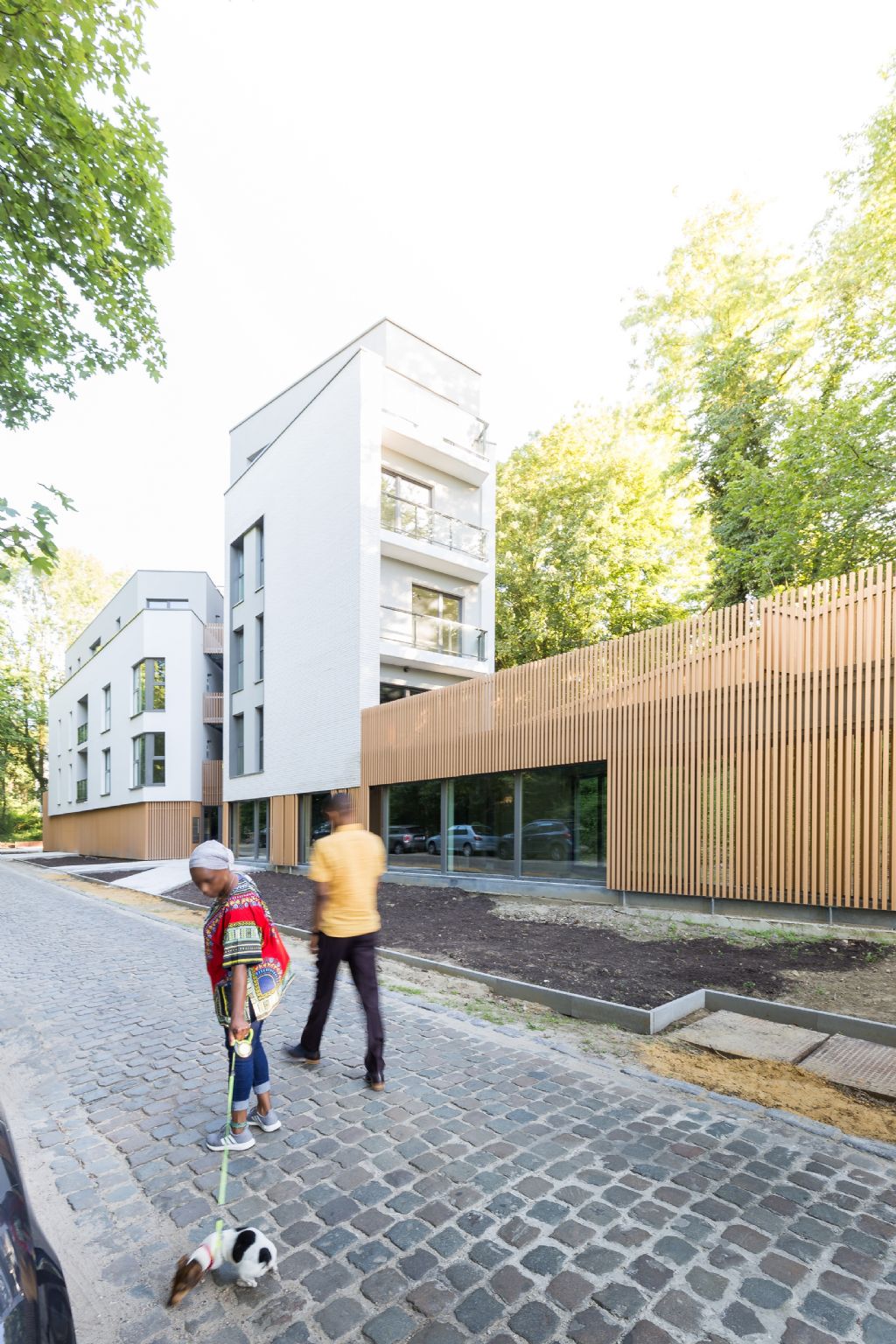 Cette décomposition en 2 gabarits graduels assure une transition urbanistique élégante et adéquate par rapport au tissu existant. Le dernier niveau de chaque volume est en léger retrait par rapport à la façade principale. Tous les volumes projetés sont couverts de toitures plates. Le projet ne comporte pas de sous-sol pour des raisons de qualité de portance de sol et de présence d’eau. Quant aux parkings, ils se trouvent au niveau du rez-de-chaussée et sont ventilés de manière totalement naturelle.