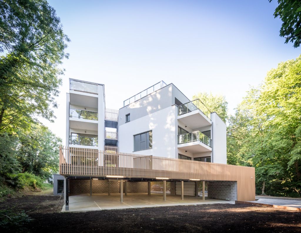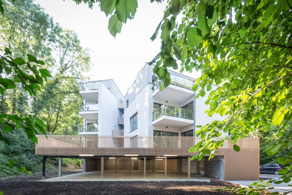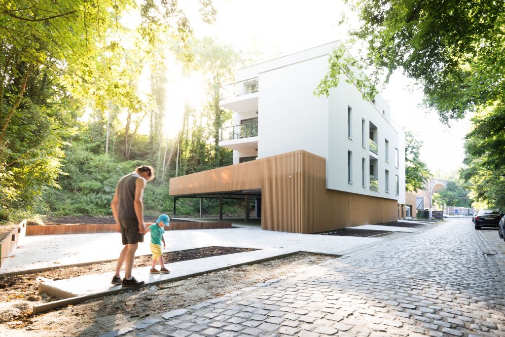 « Le ‘calage’ de l’implantation a été pensé pour profiter au mieux de l’orientation et des vues offertes par le terrain », explique Joël Meersseman. « Le bâtiment a été positionné en hauteur en tenant compte de la faible déclivité naturelle du terrain - le terrain est d’allure plate -, de manière à n’occasionner qu’un minimum de mouvements de terre et pour permettre un accès aisé, tant pour les véhicules que pour les piétons. L’ensemble des volumes construit est implanté de sorte à laisser un maximum d’espace vert au Sud de la parcelle, ce jardin commun et l’aire de jeu qu’il représente étant à la disposition des futurs habitants de l’immeuble. »