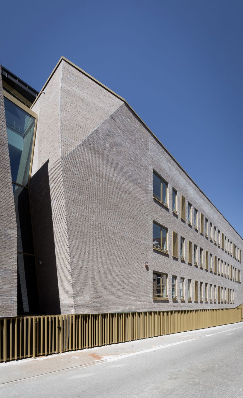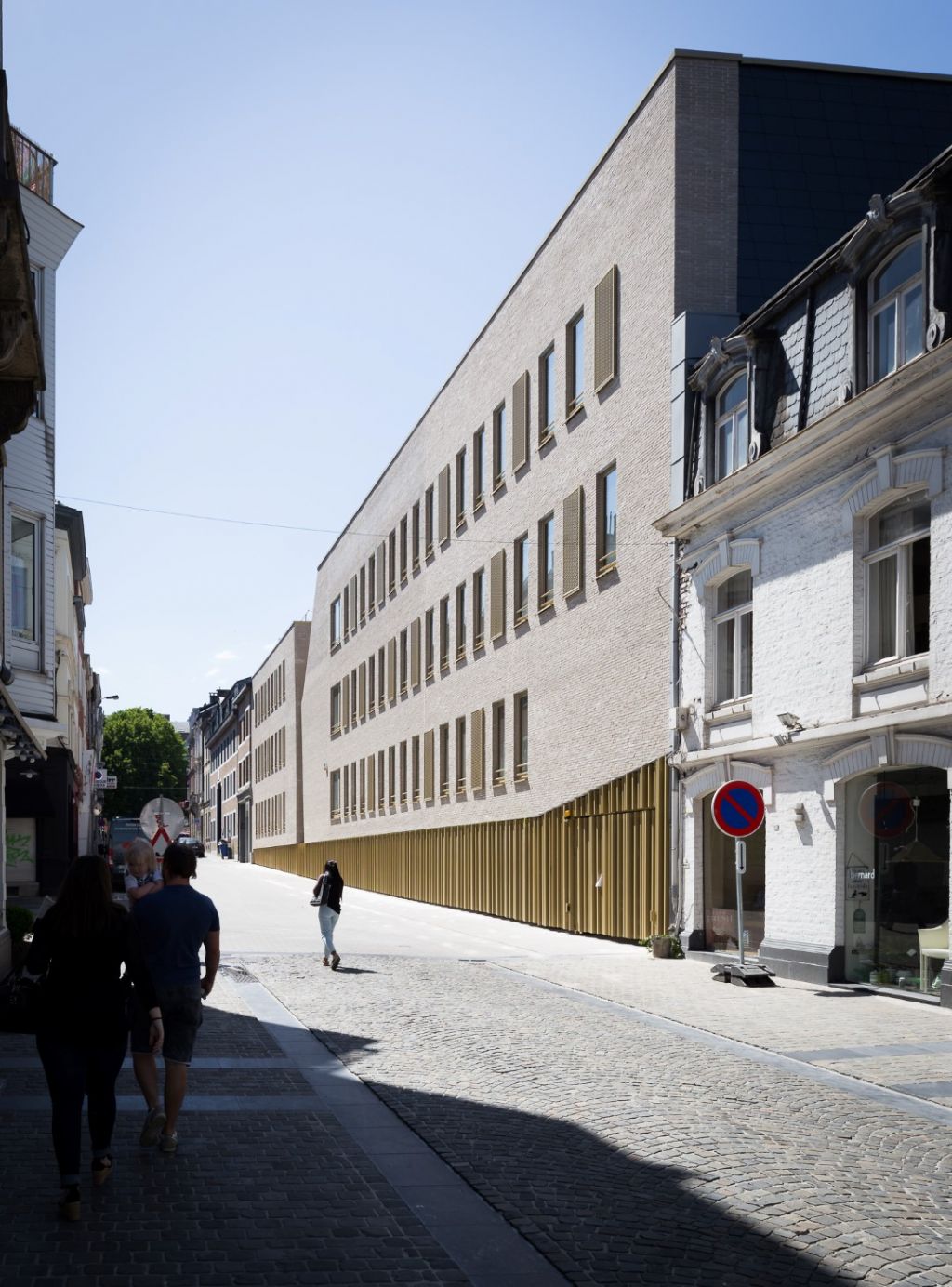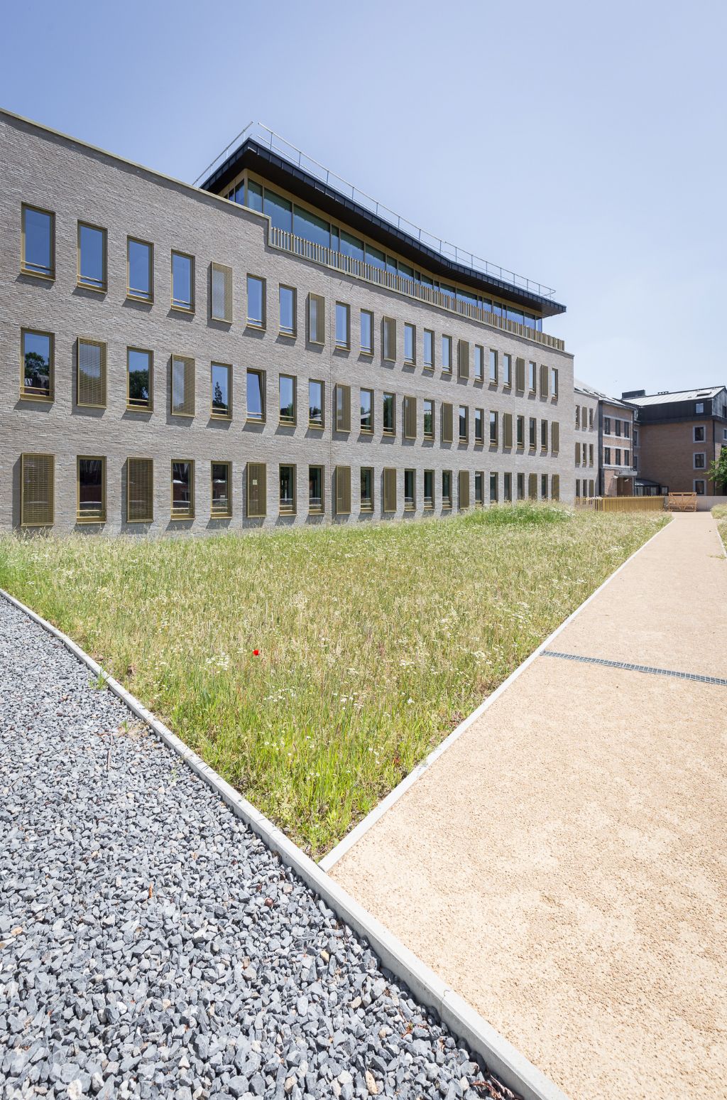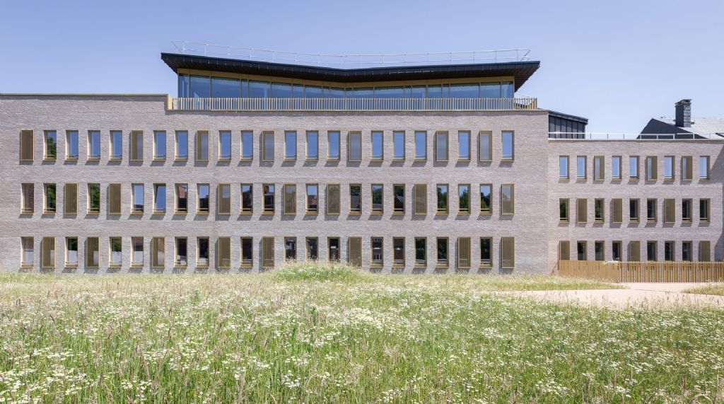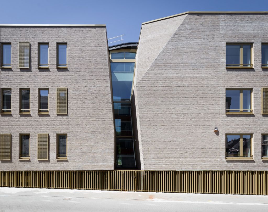 Livré en mai, le nouvel immeuble s’intègre dans un contexte urbain densément bâti en lieu et place d’une série d’immeubles à détruire. Le concept qui a mené à la forme générale du bâtiment repose sur des constats simples, tirés de la forme même de la parcelle et du tissu urbain existant. Le projet rend réellement à la parcelle les atouts qu’elle avait quelque peu perdus, à l’image de la plupart des îlots urbains, au fil du temps et au gré du développement des constructions. Le volume bâti, implanté à front de rue, libère l’intérieur d’îlot tout en préservant l’alignement et la typologie de la rue en recréant un intérieur d’îlot calme, vert et agréable, qui contribue non seulement à l’optimalisation des circulations piétonnes internes de la SWDE, mais également à l’installation d’une aire récréative pour les utilisateurs, de surcroît agréable à la vue pour les autres riverains.