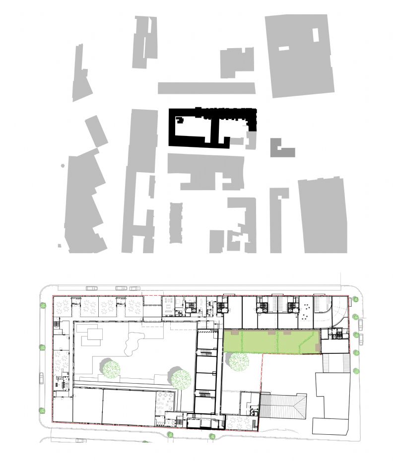 Situé entre le canal et la gare du Nord, le futur d’un îlot déconstruit a été confié par la Ville de Bruxelles au bureau d’architectes A2M, via une procédure d’appel d’offre. Le programme prévoyait la construction de 51 logements, d’une école et d’un local co-accueillantes. Le projet comprenait également la rénovation de bâtiments existants qui ont été intégrés à la démarche globale. Le projet soulevait par ailleurs un enjeu urbanistique important : l’îlot initial n’étant pas fermé, la lisibilité de la structure urbaine en était fortement affaiblie. Ce constat a alimenté les réflexions d’A2M au niveau de l’implantation et des gabarits à adopter pour rendre à la rue son caractère urbain.