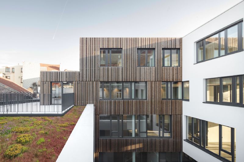 En raison de son programme important, la principale contrainte du projet consistait à intégrer l’ensemble des bureaux dans une volumétrie suffisamment aérée et privilégiant l’apport de lumière naturelle. Le bâtiment se développe en s’appuyant sur le pourtour de la parcelle, contre les mitoyens existants. Les différents étages sont conçus comme des volumes à géométrie variable qui s’imbriquent les uns dans les autres. Leur taille s’amenuisant de niveau en niveau, il font apparaître un patio central qui s’ouvre vers le ciel et crée une respiration dans l’îlot. L’ensemble s’articule autour de ce vide grâce auquel la lumière naturelle entre au mieux dans les bureaux, quel que soit leur emplacement. Les avancées, débordements, terrasses et toitures végétalisées apportent du rythme au coeur du projet, accentué par l’alternance entre les parements en bardage bois et en crépi et la composition des différentes baies.
