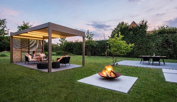 Une terrasse aux multipes facettes avec toiture fixe et orientable