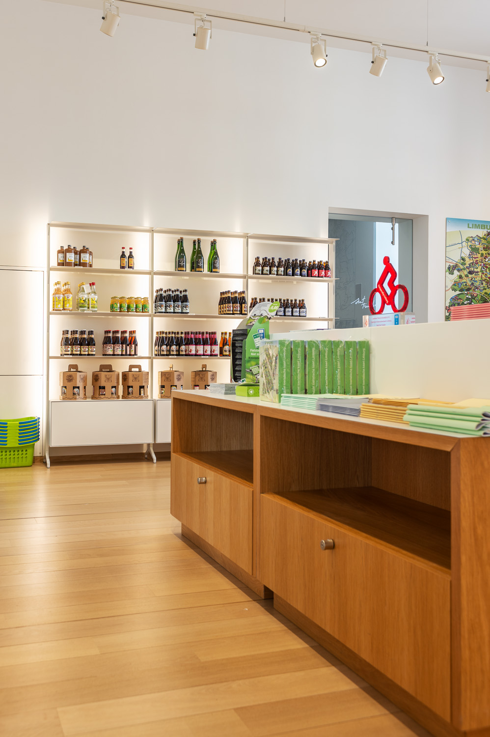 Le parquet en bois de la boutique des produits régionaux a été entièrement poncé et traité. Le nouveau plancher surélevé a été complété par un parquet en chêne similaire pour créer une plus grande unité entre les différents espaces. Le nouvel intérieur est principalement composé de mobilier blanc afin de mettre au maximum en valeur les produits régionaux présentés.
