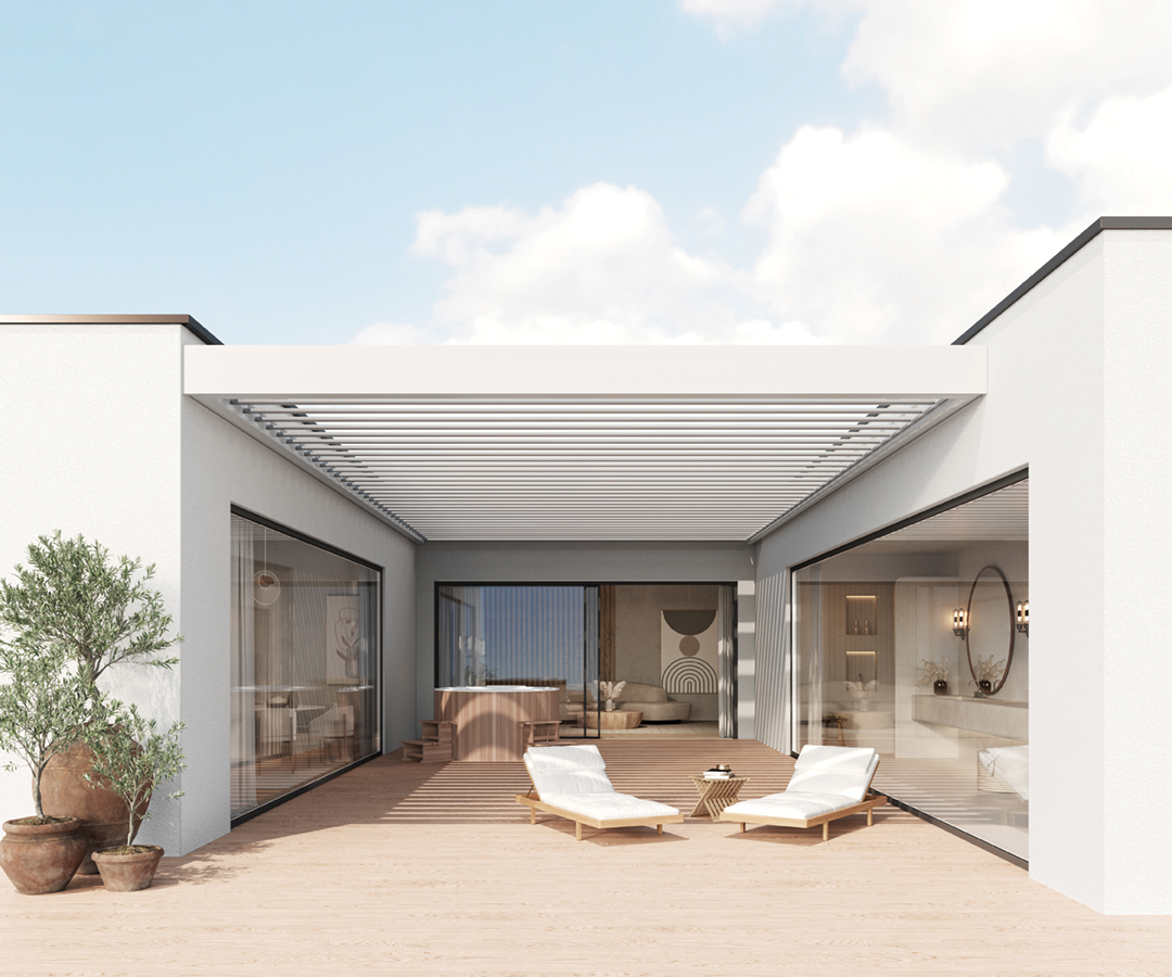 La pergola Somnium est un veritable coup de coeur dans le jardin mais est également de plus en plus demandée dans l’horeca. Grâce au système de rotation automatique, les lames en aluminium de Somnium s’ouvrent et se ferment toujours simultanément. Les lamelles pivotent jusqu’à 120° pour un confort optimal. Vous pouvez ainsi laisser le soleil jouer librement, tempérer un peu les rayons ou les bloquer complètement.
