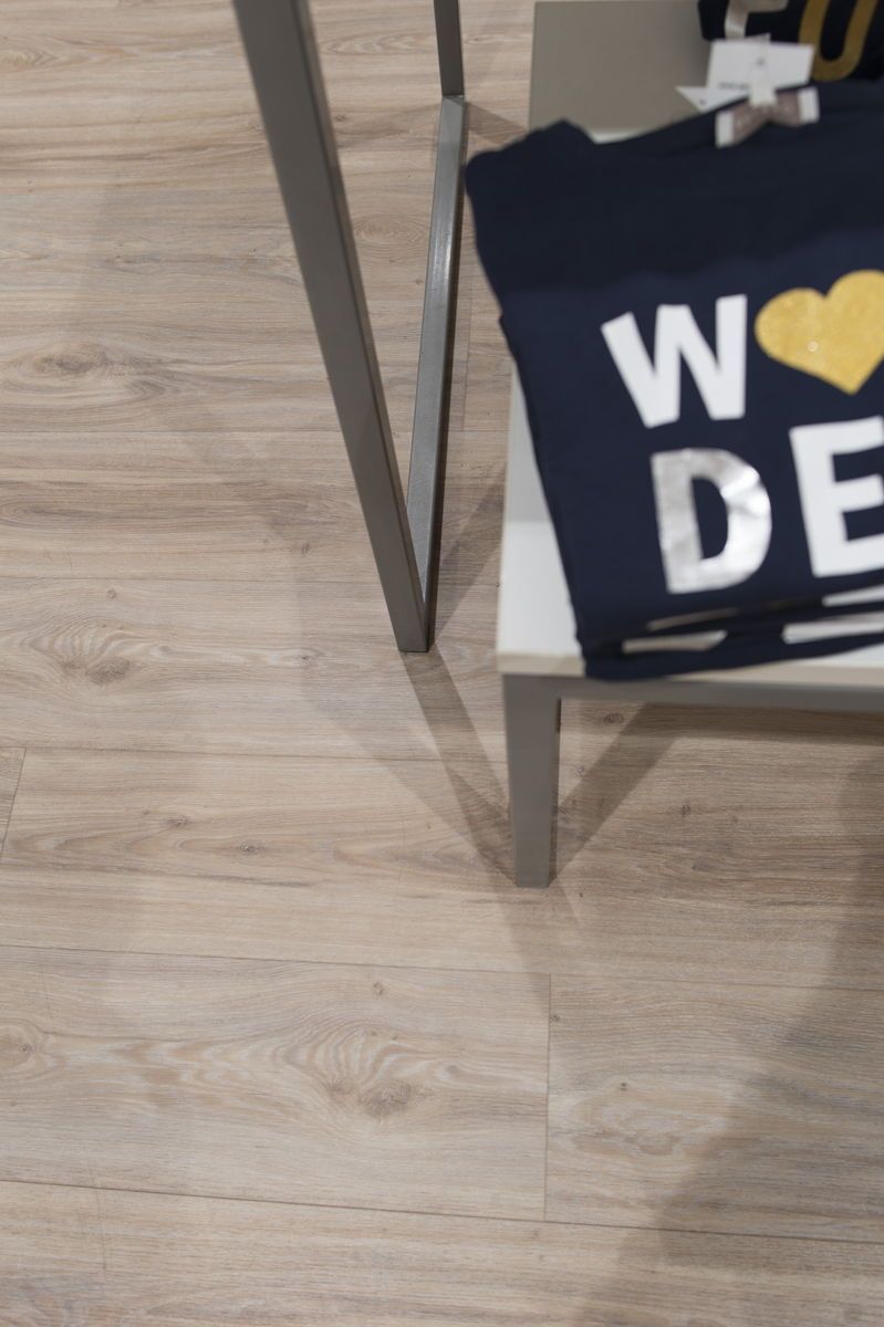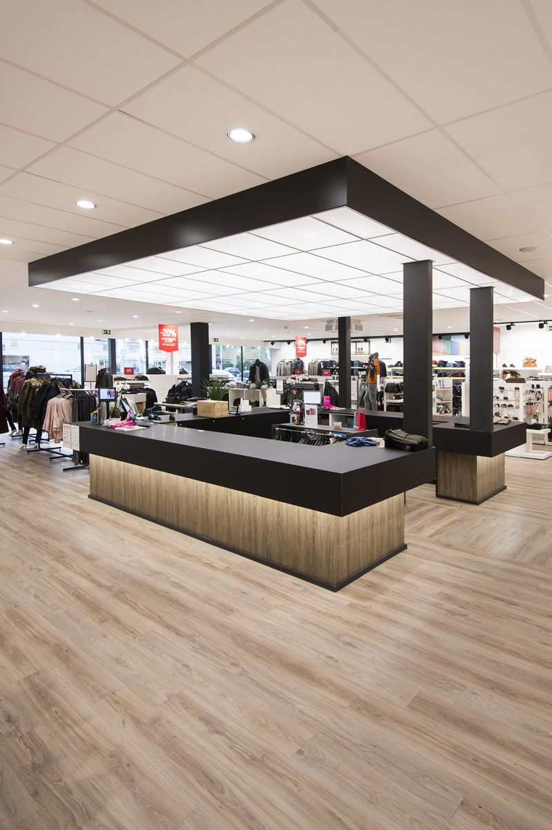 Une ambiance neutre mais chaleureuse constitue le fil conducteur de l'aménagement dans les magasins de Waregem, Poperinghe, Ypres, Saint-Georges-sur-Meuse et Schelle. « Le revêtement Transform BlackJack Oak de Moduleo s'intègre parfaitement dans ce cadre-là. Dans les magasins, nous utilisons une lumière froide pour une perception optimale des couleurs des articles de mode. Grâce au sol, nous pouvons néanmoins maintenir une ambiance chaleureuse, en association avec des nuances spécifiques apportées par le mobilier. »