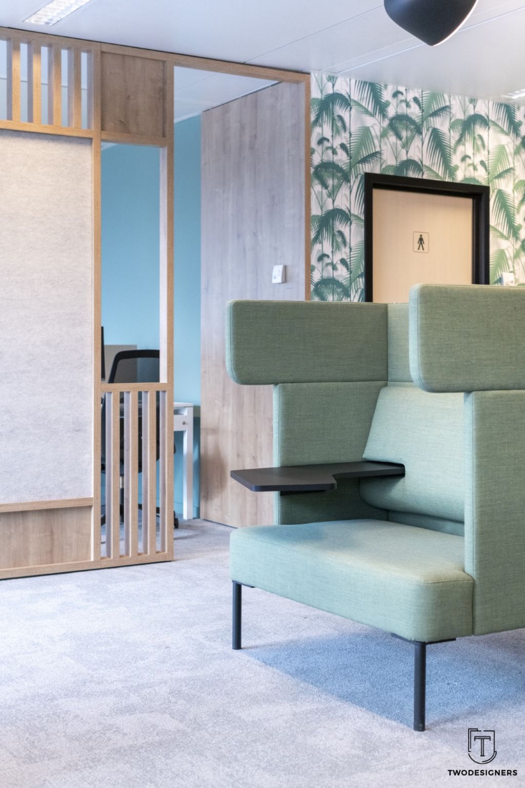 Le but était d’offrir un tout nouvel espace de travail afin que 50 à 80 collaborateurs puissent œuvrer dans les meilleures conditions possibles. L’objectif principal était de donner aux collaborateurs l’envie de revenir travailler plus régulièrement au sein de l’asbl. Twodesigners avait donc pour idée de développer un environnement de vie et de réflexion ergonomique, cosy et inspirant. L’agence a relevé le défi en aménageant un espace ralliant esthétisme, fonctionnalité et confort en intégrant, pour les équipes, entre autres, des espaces de réunion fermés, ouverts, d’isolation acoustique (pour les appels téléphoniques par exemple), ainsi que des salles de formations polyvalentes et créative, ou encore une cuisine.