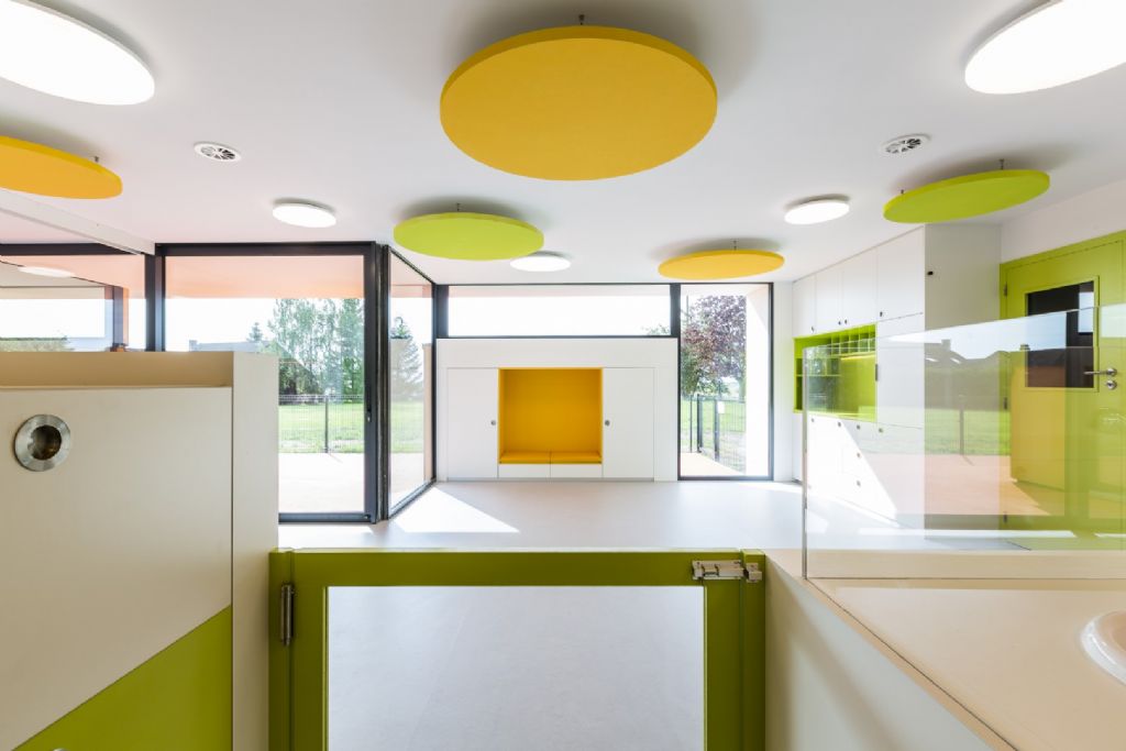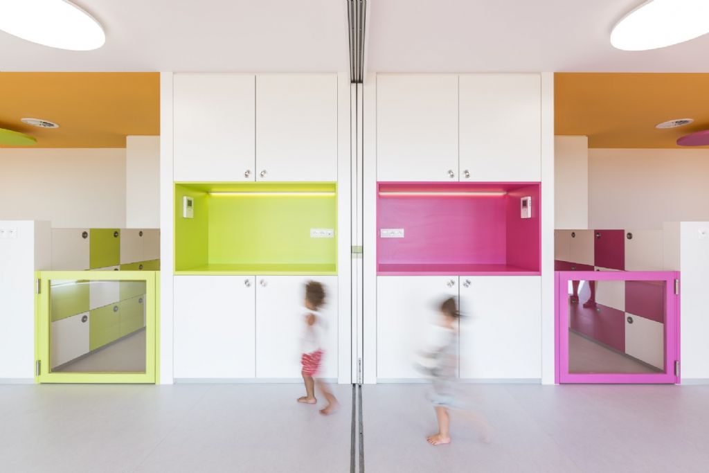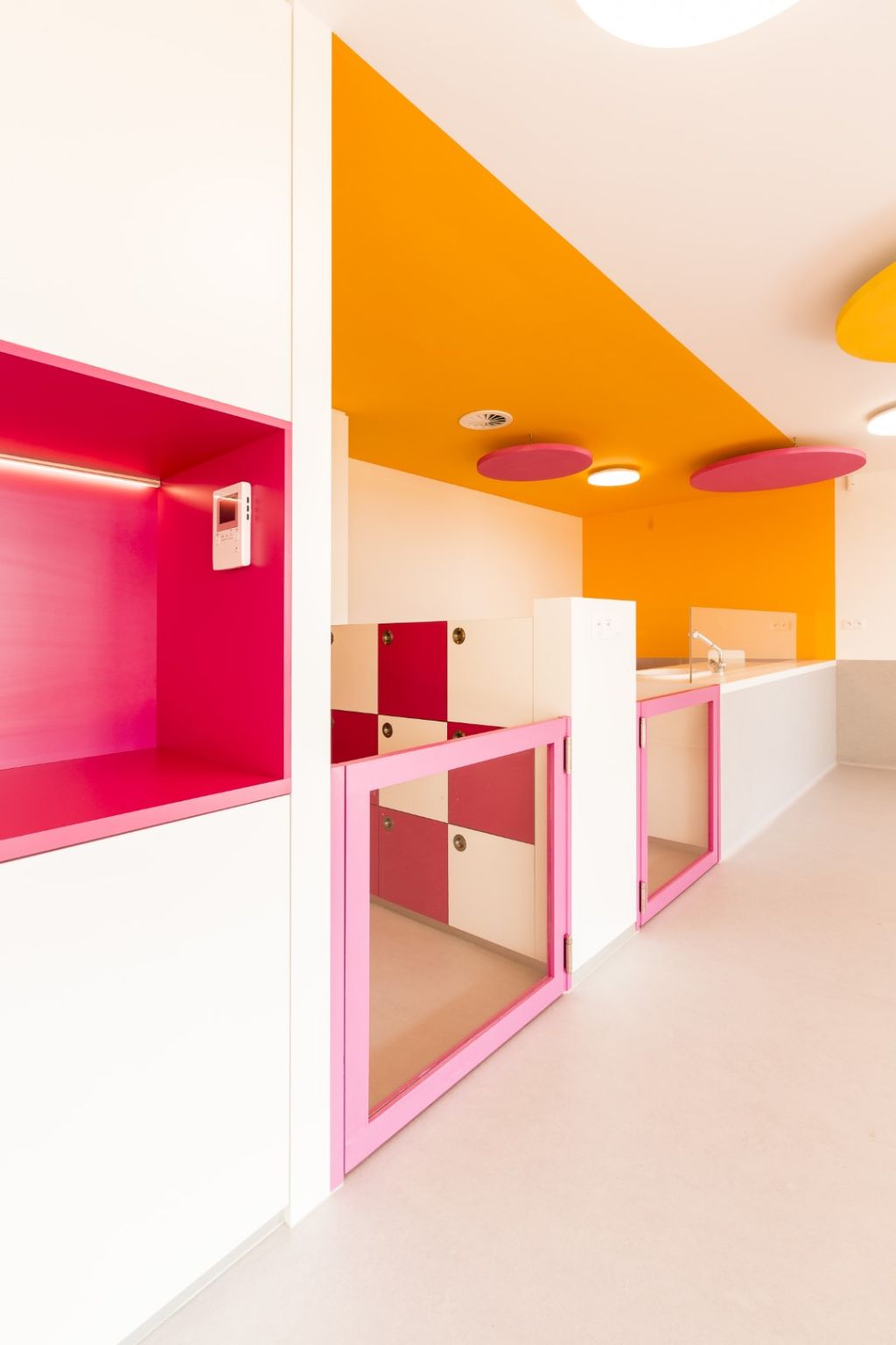 Les architectes confirment : « Pour la crèche des Mésanges, l’enjeu a été de composer avec une palette de couleurs suscitant différentes émotions tout en formant une harmonie. Le choix s’est porté sur des couleurs vives véhiculant un sentiment de bonheur et de gaieté. Certaines couleurs sont stimulantes, d’autres insufflent la douceur et l’apaisement. Ainsi, un contraste se marque entre l’espace de jeux et d’apprentissage et la salle de sieste qui reproduit la sensation bénie du refuge après le défoulement total. »