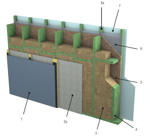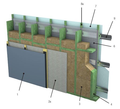 La figure 2 illustre l'un des concepts développés au cours de ce projet. Il s'agit d'une variante constituée de profilés à ressort ou d'une ossature métallique légère dont la valeur RAtr est d'environ 50 dB (ou plus, selon le revêtement extérieur choisi). Les bonnes performances acoustiques obtenues sont dues, d'une part, au fait que les parois constituant ce mur creux sont séparées l'une de l'autre au moyen des profilés à ressort cités ci-dessus (voir 9 à la figure 2) et, d'autre part, au fait que l'espace intercalaire est rempli de laine minérale (voir 3 à la figure 2). Toutefois, cette double paroi acoustique comporte, elle aussi, un important inconvénient : dans le cas d'une façade légère porteuse constituée d'une ossature en bois, un panneau extérieur spécial (voir 2a à la figure 2) doit être prévu, afin d'assurer la résistance en cas d'incendie. Etant donné que de tels panneaux sont presque toujours étanches à l'air et à la vapeur, il existe un risque réel d'accumulation d'eau si une infiltration d'air intérieur se produit localement dans l'isolation. Le pare-vapeur doit donc être placé de manière impeccable.