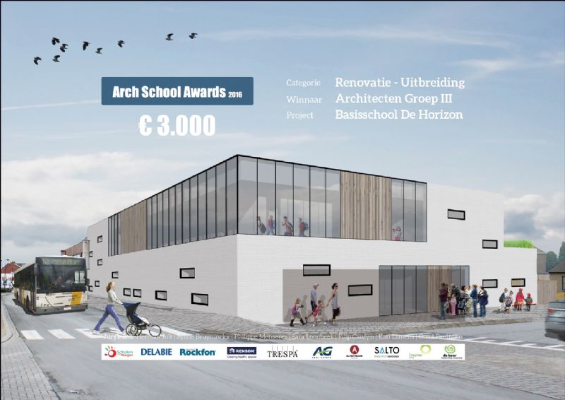 L'Arch School Award 2016 de la meilleure rénovation/extension est allé à Architecten Groep III pour son projet ‘Basisschool De Horizon’ à Koolskamp. Le jury relève le fait que ce projet, réalisé en DBFM dans un véritable 'bled', contribue à la renaissance de tout un village. Architecture soignée et ludique. Intégration réussie d'espaces verts, d'un potager, d'un compost et d'une toiture végétalisée. L'Arch School Award 2016 du meilleur futur projet a été remis à Markant Architecten pour le projet 'Don Bosco Hoboken’. Le jury a particulièrement apprécié le caractère industriel du bâtiment qui témoigne du respect de l'architecture présente sur le site.