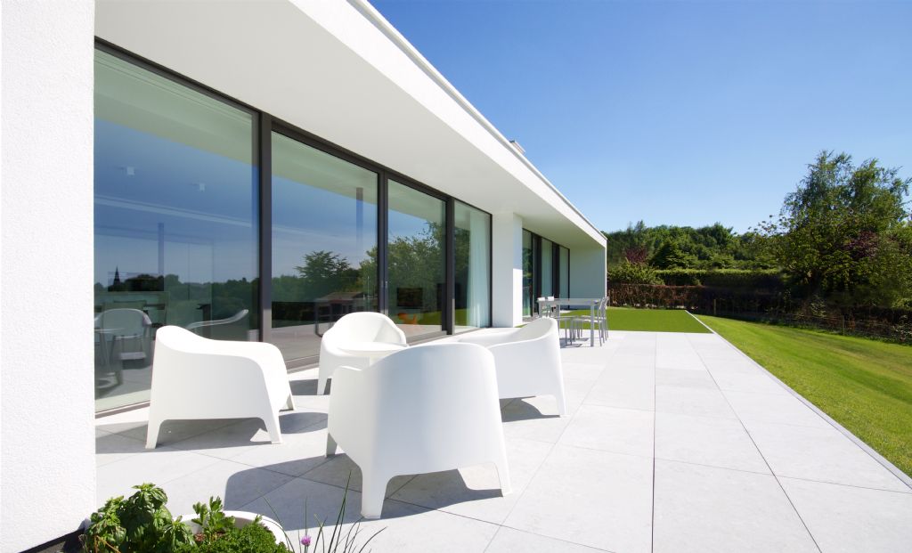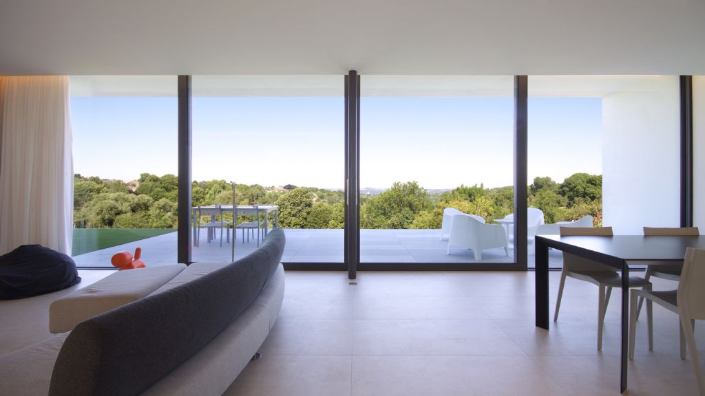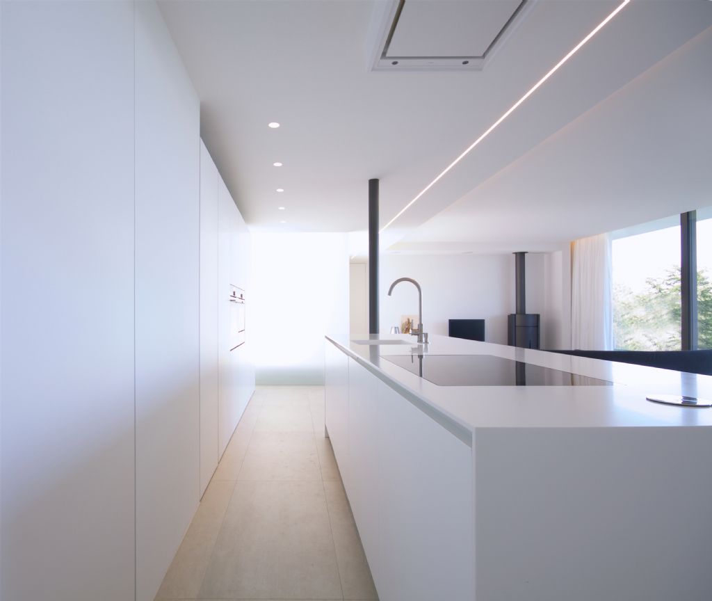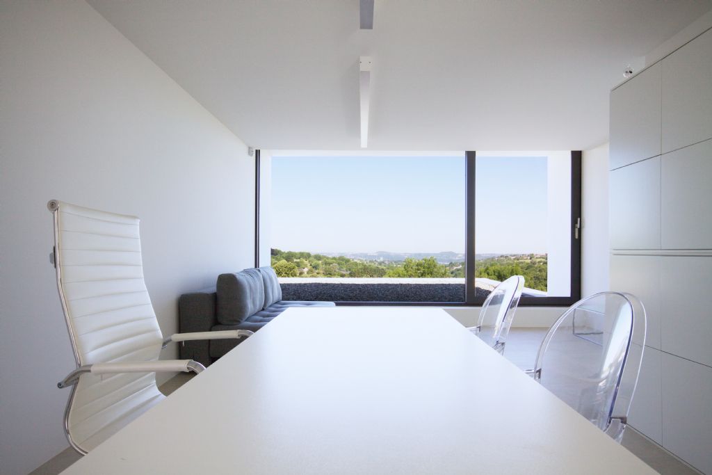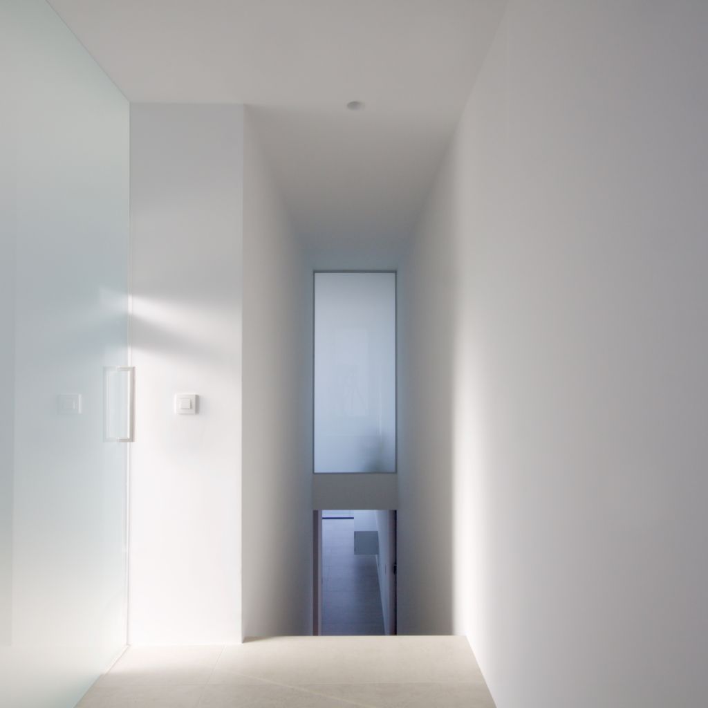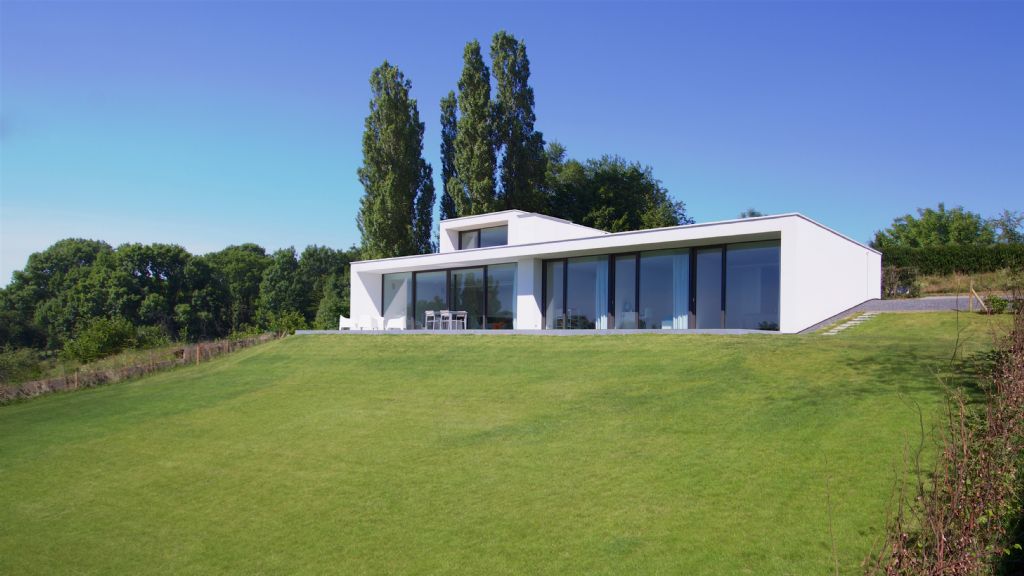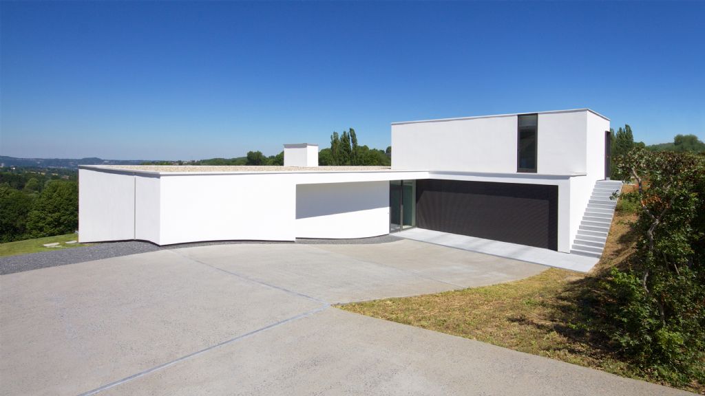 Toutes les pièces de vie sont situées de plain-pied à un niveau inférieur par rapport à la route. Elles se prolongent vers l’extérieur par un débordement de toiture, au travers d’une façade entièrement vitrée, donnant sur une spacieuse terrasse. Seule la partie bureau au niveau supérieur est visible et accessible depuis la rue. La vue pour les piétons reste ainsi dégagée, minimisant l’impact de la maison dans son environnement. Les matériaux sont sobres, homogènes, minimalistes. Seuls trois matériaux sont utilisés à l’extérieur : le crépis blanc pour les façades, l’aluminium pour les menuiseries extérieures et bardages de la porte du garage, ainsi que la pierre pour les terrasses et aménagements des abords. A l’intérieur, le blanc domine majoritairement sur les murs et le mobilier intégré. Les autres matériaux présents sont clairs, lumineux et apaisants. Le projet se veut minimaliste et épuré, créant ainsi un environnement propice à la détente et au repos.