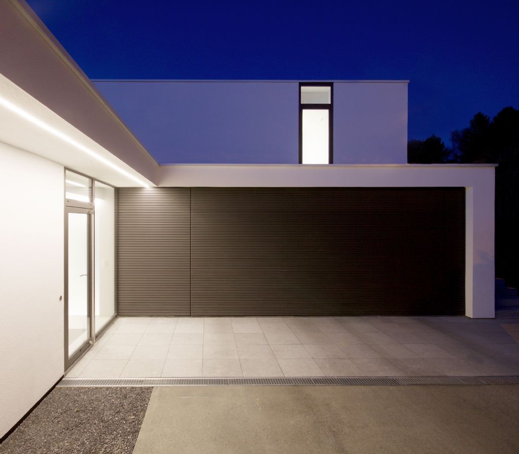 La partie professionnelle est accessible directement depuis la route par une porte en verre translucide, soulignée sobrement d’un cadre en aluminium. Elle se compose d’un hall d’entrée avec vestiaire et toilettes, ainsi que d’un spacieux bureau profitant d’une vue remarquable. La partie privée de la maison est accessible par le niveau inférieur. Les portes coulissantes et parois de verres offrent intimité à la maison, tout en laissant pénétrer la lumière du sud. Les différences de hauteurs de plafond permettent de répartir la cuisine, la salle à manger et le salon dans un seul espace ouvert sur le paysage. L’espace nuit est isolé du séjour par une porte acoustique. La buanderie et la salle de bains des enfants sont placées côté rue, alors que les chambres profitent du jardin. Au bout du couloir, la chambre parentale comprend en plus du lit, un coin douche, une penderie et une baignoire lumineuse. Le garage et les caves permettent de dissimuler à la vue, les nombreux objets non indispensables à la vie de tous les jours, ainsi qu’un espace de détente.