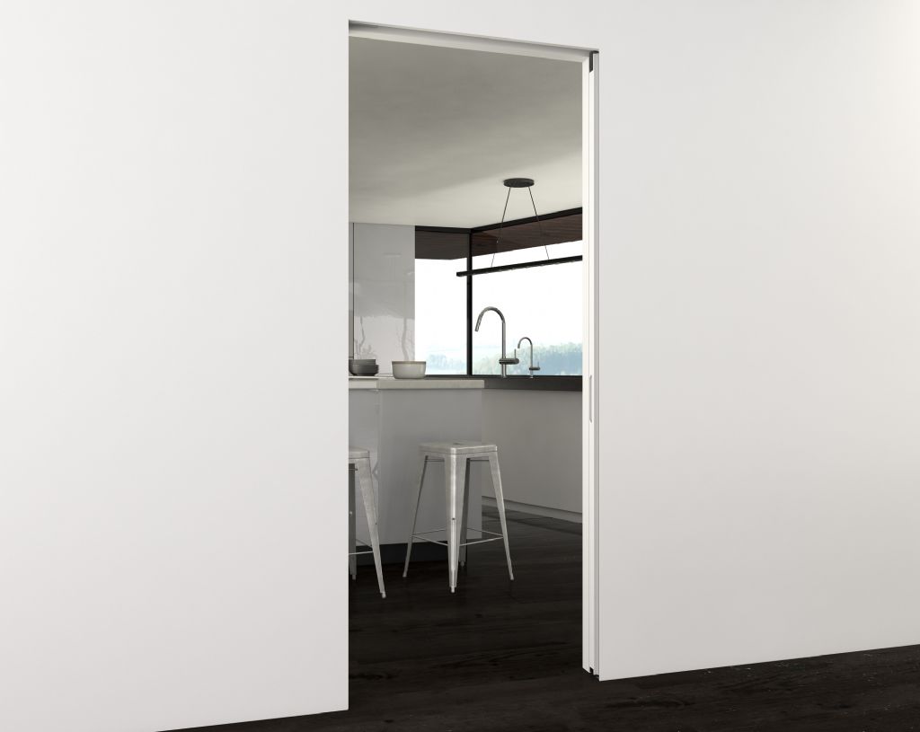 Lors de l’ouverture, la porte disparaît dans la paroi : une économie de place qui caractérise toutes les portes à galandage d’argenta. L’ouverture visible dans la paroi lorsque la porte coulissante est en position fermée, est recouverte à l’aide d’un profil de recouvrement mobile. Ce système coulissant convient pour des portes coulissantes en bois jusqu’à 40 kg et est équipé en standard du système ‘softclose’ et ‘auto-eject’ pour une manœuvre facile. Tous les éléments intégrés sont faciles d’accès pour un démontage ou un réglage éventuel.