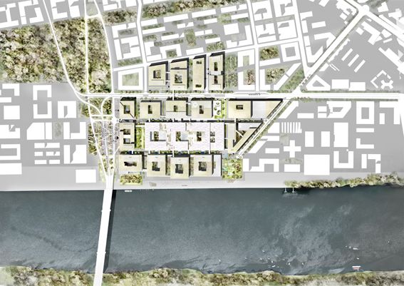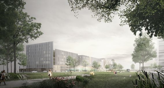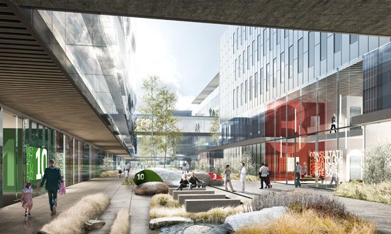 L’organisation concentrique autour du plateau technique central (centres opératoires et imagerie) rend ce dernier directement accessible à tous les services de l’hôpital qui y sont liés, tels que les urgences et les soins critiques au Nord, les hébergements au Sud. Cette organisation prévoit également une hiérarchisation des flux (flux piétons au rez de chaussé et flux malades couchés au 1er étage). La grande allée-jardin qui part du hall principal Ouest-Est dessert les halls publics des cinq pôles hospitalouniversitaires et l’accès externe à l’imagerie. Cette organisation permet une distribution simple et claire de la majorité des flux de patients externes et de visiteurs. À l’inverse, les activités qui nécessitent un accès plus « confidentiel » bénéficient d’une entrée plus intime, détachée de la grande allée jardin et du hall principal.