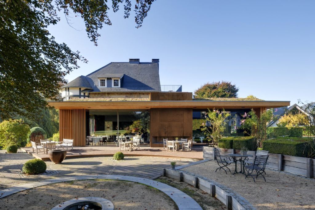 « L’entièreté du bâtiment ancien existant a été conservée tandis que les diverses annexes construites au fil du temps ont été remplacées par un volume abritant la grande salle de réception et un espace de stockage », expliquent les architectes. « Le volume de la nouvelle annexe se veut volontairement sobre, préservant au mieux et mettant en valeur le caractère de la bâtisse principale. » Quant aux grands châssis coulissants intégrés, ils estompent la limite entre intérieur et extérieur et projettent l’espace du restaurant vers la terrasse extérieure ombragée.