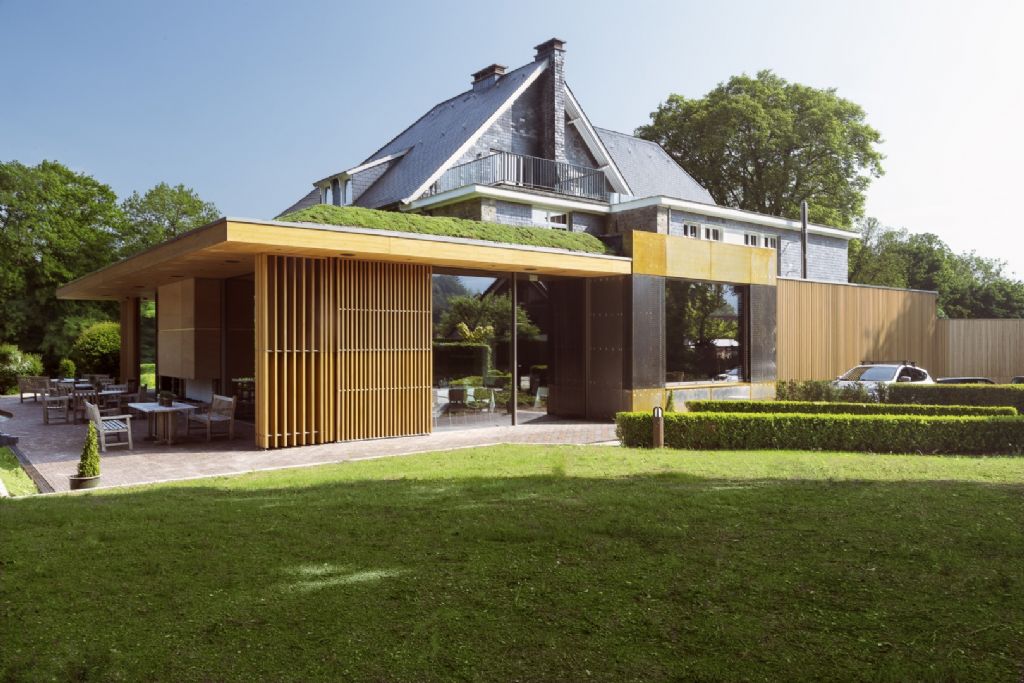 L’hôtel étant situé en Ardenne, entouré d’arbres remarquables, il était naturel pour les architectes de mettre le bois en valeur, tant au niveau structurel que dans les habillages extérieurs ou intérieurs, comme cela avait déjà été le cas dans l’extension de 2008 : « La nouvelle annexe reprend les jeux de matériaux de l’extension accueillant les chambres de l’hôtel, le bardage bois ajouré dialogue avec les éléments ponctuels exprimés en acier Corten. »
