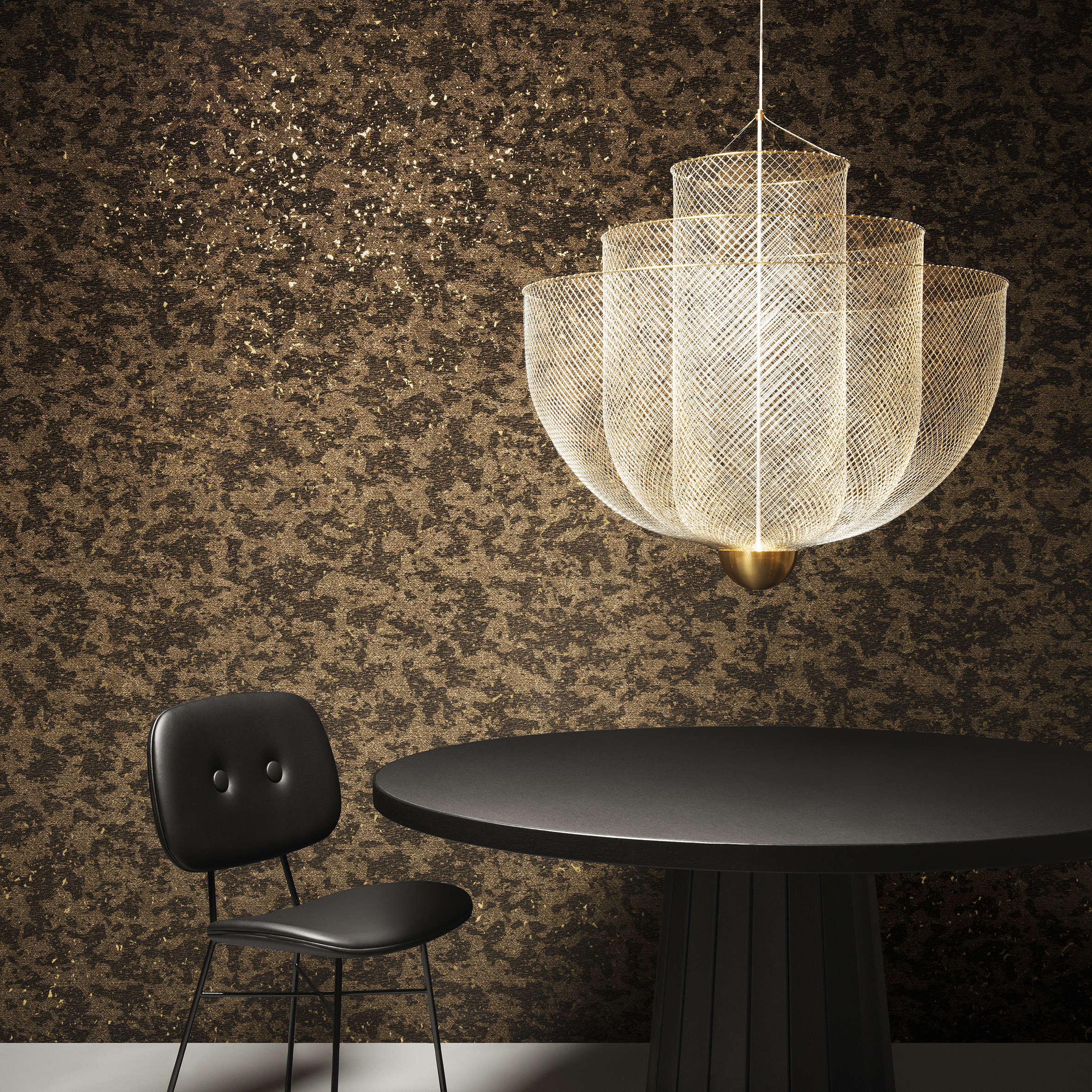 Un revêtement mural à base de film imprimé de liège et une finition effet velours, inspiré de la fourrure du Bearded Leopard - du jaune pâle au doré profond, parsemé d’une constellation de boutons de rose noirs.