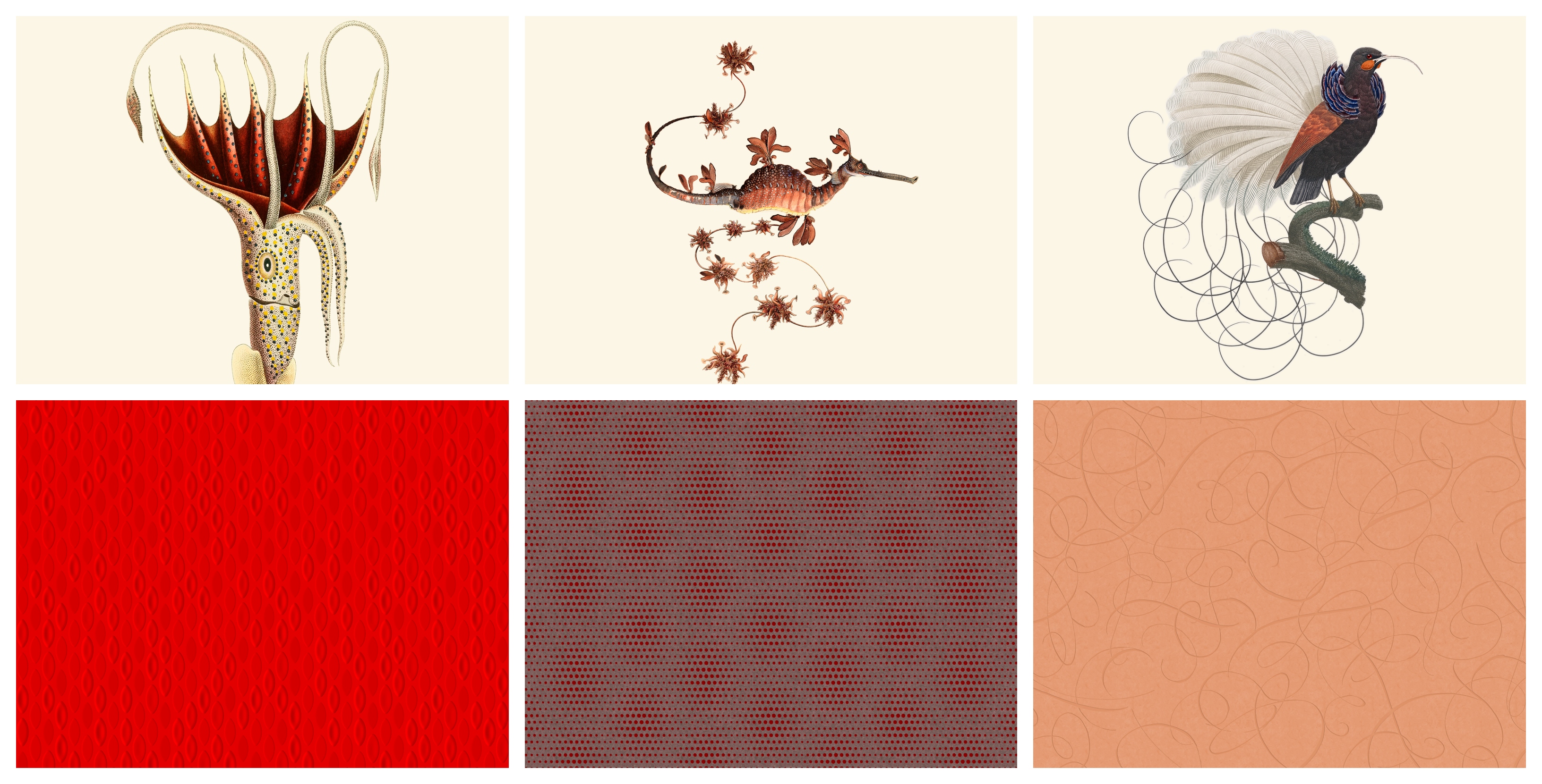 Un revêtement mural imprimé avec une finition effet velours inspiré par les mystérieux Blooming Seadragons, dont les appendices spectaculaires à l’allure de feuilles jaunes, brunes et vert foncé faisaient office de camouflage intelligent.