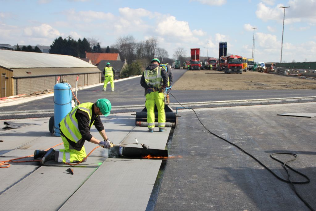 Pour la réalisation de grandes surfaces, SOPREMA a développé la Mini Macaden (machine à Denis). La machine à air chaud convient pour dérouler automatiquement, souder et compresser les membranes bitumineuses de maximum 10 mètres de long. La Mini Macaden apporte son lot d’avantages. Outre l’excellente ergonomie (le maniement de la machine demande en effet moins d’efforts), la qualité optimale de soudure et un traitement plus rapide sont d’autres éléments importants. Andy Timmerman, chef de chantier chez Aswebo : « Grâce au traitement efficace, nous pouvons travailler au moins deux fois plus vite qu’avec une pose manuelle du bitume. » En attendant la Macaden commandée, Aswebo en a louée une avec opérateur via SOPREMA.