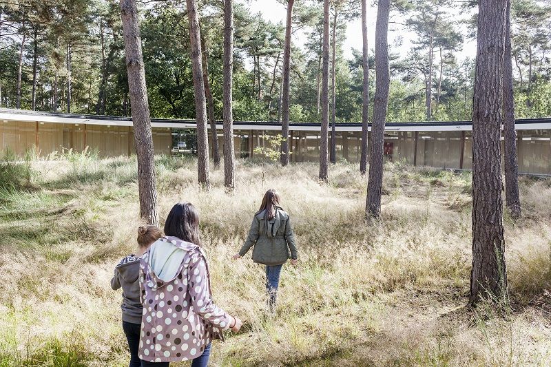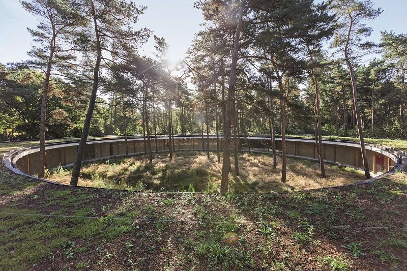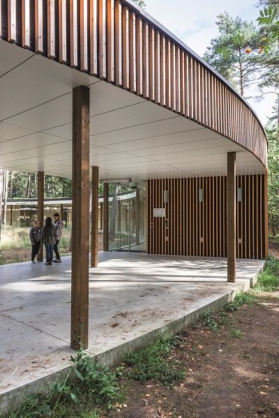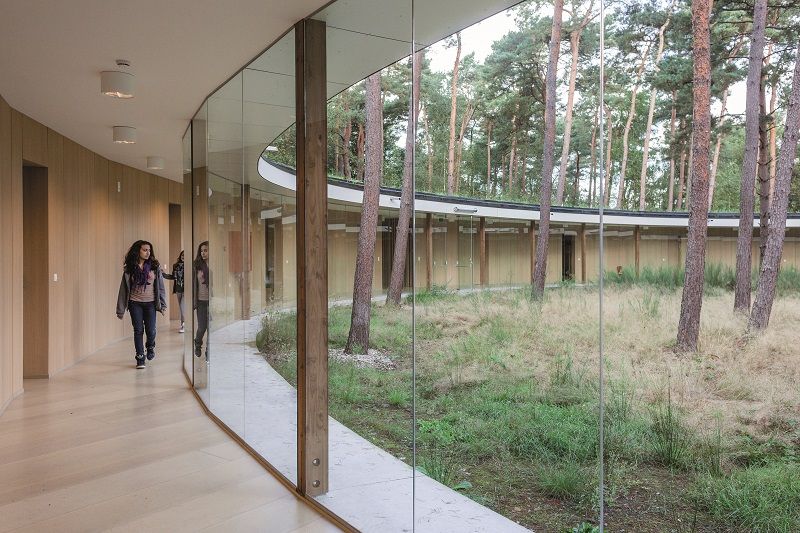 L’auberge de jeunesse Wadi est sans aucun doute l’un des plus beaux exemples d’architecture verte. Le bâtiment circulaire et transparent est totalement intégré dans le paysage naturel des Hoge Rielen, ce qui le rend remarquable par son empreinte minimale. La construction circulaire en bois se distingue par son extraordinaire discrétion. Subtilement intégrée dans son environnement, elle ne se repère pas directement. Une multitude de vitrages permet de communier avec la nature, tandis que la toiture verte apparaît comme un prolongement des plantations au sol. Les piliers de bois qui soutiennent la construction sont autant d’échos à la verticalité des arbres tout proches. L’auberge compte vingt chambres pour un total de 76 lits. Chaque chambre dispose d’un petit bureau et d’une salle de bains avec douche et wc. Le nom Wadi réfère au système naturel de filtration des eaux de pluie qui se trouve au centre de la placette intérieure. (Note : texte paru précédemment dans le numéro 181 de la revue Architrave)