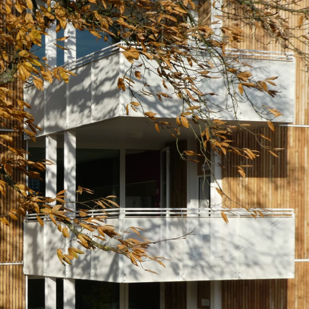 Un autre enjeu était de proposer des terrasses couvertes (préaux) suspendues dans et au bord des trois châtaigniers remarquables. L’ergonomie des usages intérieurs est organisée pour offrir au personnel un visu sur ce paysage.