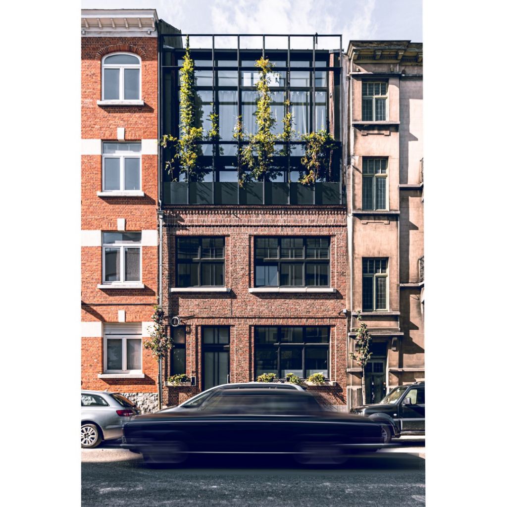 Il y a également le projet de la maison unifamiliale ‘Camille Lemonnier’, à Ixelles. Ici, à l’inverse de la crèche, nous tentons d’offrir un fragment de paysage dans une rue très minérale en proposant un recul de la façade de la rehausse pour former un creux végétalisé. Sur l’alignement, une fine structure métallique sert de tuteur aux plantes grimpantes. Celle-ci offre un filtre contre la surchauffe et une privacité au logement.