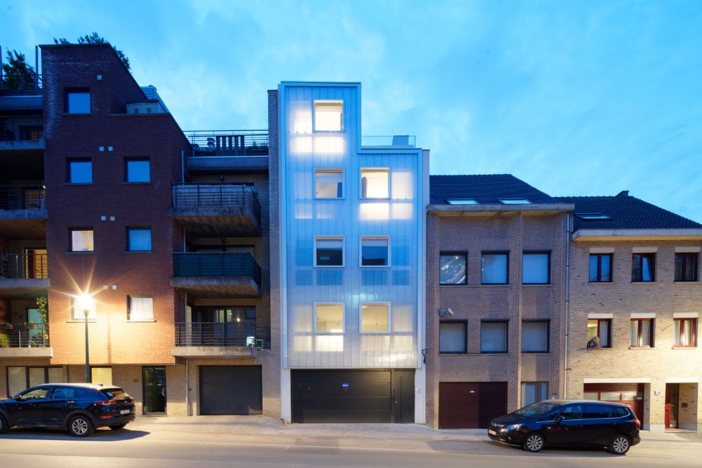 Un de nos projets que je voudrais mentionner ici est Korenbeek 161, un immeuble résidentiel composé de trois appartements en duplex, qui s'emboitent en L, comme des pièces d'un puzzle chinois. Une façade sud en polycarbonate maximise l'apport de lumière naturelle dans les chambres tout en offrant une intimité grâce à son caractère translucide. En soirée, une lumière diffuse provenant de ces mêmes espaces intérieurs éclaire la rue. Tout au long de la journée, donc, le bâtiment change graduellement d’aspect et de transparence, grâce au transfert de lumières dans ces deux sens. Un deuxième projet en cours concerne l’extension d'une maison unifamiliale située à Malines. L’approche consiste à localiser les zones de contact entre la maison existante et la nouvelle extension, et développer le potentiel des espaces générés par ce liaisonnement : les doubles hauteurs, la circulation verticale et les corridors constituent les points forts de ce projet.