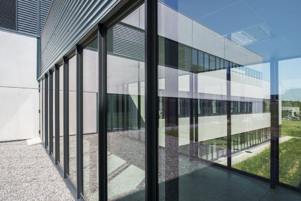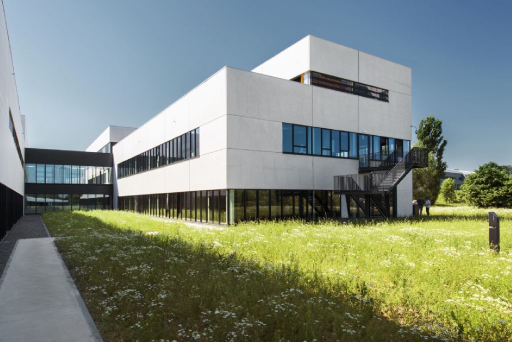 La Plateforme Wallonne de Thérapie Cellulaire ensuite, un projet dans le domaine de la recherche et de l’industrie pharmaceutique implanté dans l’aéropôle de Gosselies qui comprend des bureaux, des laboratoires et des zones de production. L’originalité du projet est de réunir deux sociétés qui partagent des services communs tout en conservant leur indépendance. Une rue centrale assure le lien entre les bâtiments ouverts sur des jardins. Sans distinction de fonction, les façades sont traitées de manière très graphique avec des panneaux de béton blanc et des menuiseries métalliques gris foncé. Cette unité de ton confère une forte présence au complexe.
