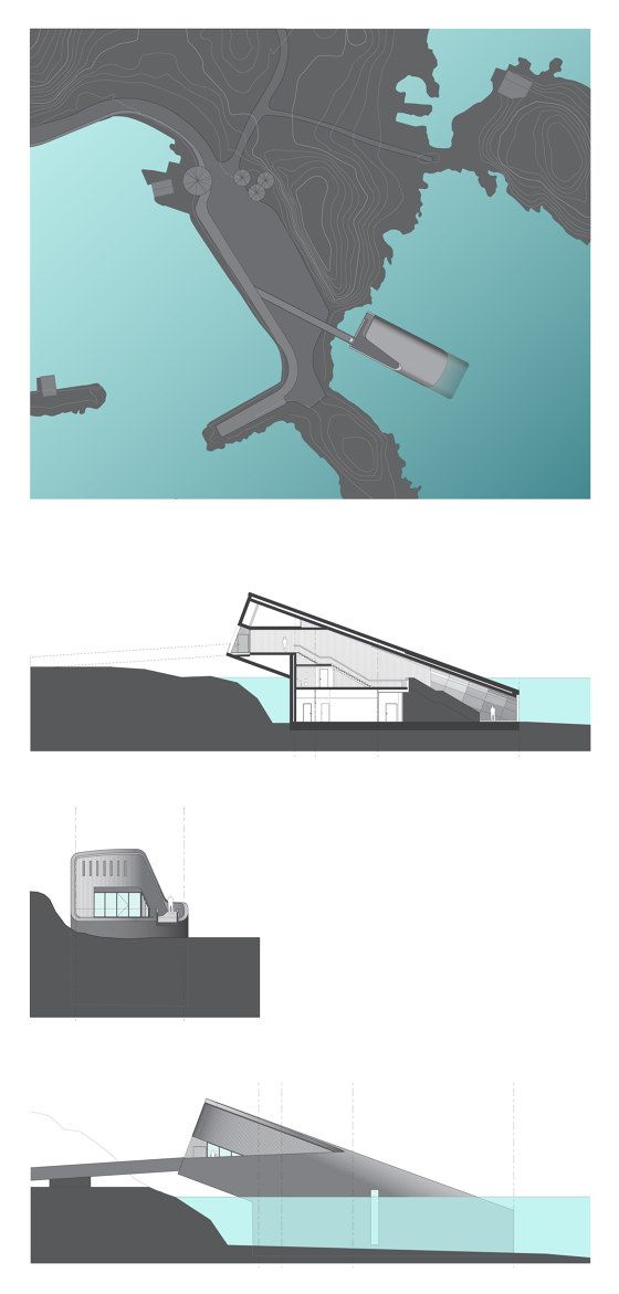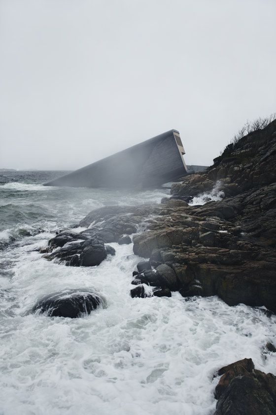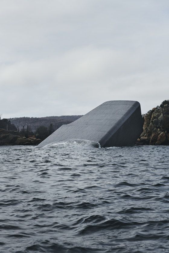 À moitié enfoncé dans la mer, le bâtiment monolithique, long de 34 m, casse véritablement la surface de l'eau pour reposer directement sur le fond marin, 5 m plus bas. La structure est conçue pour s'intégrer pleinement dans son environnement marin au fil des années, car la rugosité de la coque en béton fonctionnera tel un récif artificiel, accueillant notamment des coquillages et des algues. Adossés au rivage escarpé, les murs en béton de la structure, d’un demi-mètre d’épaisseur, sont conçus pour résister à la pression et aux chocs provoqués par la mer agitée. Comme un périscope englouti, la grande fenêtre du restaurant offre une vue sur les fonds marins, au fil des saisons et des conditions météorologiques.