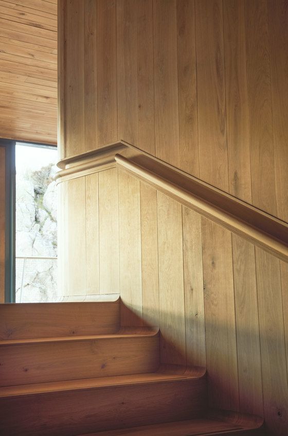 La pointe de Lindesnes est connue pour ses conditions météorologiques changeantes et intenses, passant plusieurs fois par jour du calme plat au déchaînement des éléments. Pour les visiteurs qui arrivent sur le site, l’indiscipline des éléments extérieurs se dissout dès qu’ils pénètrent dans le hall d’accueil du restaurant, à l’atmosphère feutrée et recouvert de chêne. Les finitions en bois brut et le doux parfum du bois font la transition vers un élégant escalier en chêne qui permet de descendre dans le bâtiment. Des balustrades en acier noir brut et des mains courantes en tubes de laiton conduisent à un intérieur plus doux à mesure que la surface du plafond passe du chêne au textile. L'atmosphère chaleureuse et accueillante à l'intérieur du restaurant inspire une sensation de respect et de mystère.