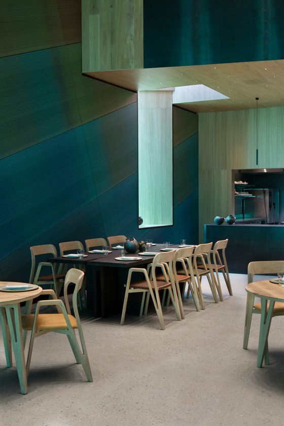 Une série de meubles a été conçue exclusivement pour le restaurant, avec une chaise en tant qu’artefact central. Celle-ci est conçue comme une forme continue qui imite la manière dont les branches progressent naturellement de la tige de l’arbre vers l’extérieur (ici, les coins anguleux). Conçus selon des méthodes artisanales traditionnelles, les meubles représentent la philosophie du projet dans son ensemble : construire des structures solides pour le futur sans compromettre la beauté naturelle inhérente aux matières premières.