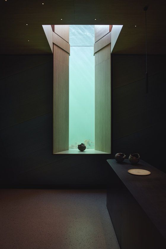 Au niveau de la mezzanine et du bar, là où le bâtiment touche la mer, une fenêtre verticale est découpée dans le côté du bâtiment et s’étend jusqu’au fond de la mer. Elle révèle la convergence de la mer et de l'air, avec une ligne de flottaison dont la fluctuation change en fonction de l'intensité du vent. Au fond de la mer, dans une salle à manger prévue pour 40 personnes, se trouve l'œil panoramique du bâtiment. Une fenêtre horizontale de 11 m de large sur 3,4 m de haut offre une passerelle visuelle vers la mer et relie les invités à la vie sauvage de l'extérieur. La vue par la fenêtre évolue progressivement au fil de la journée et des saisons. La couleur de l’eau passe du bleu saphir lors des froides journées d’hiver au vert émeraude en été, au moment où les algues s’installent.